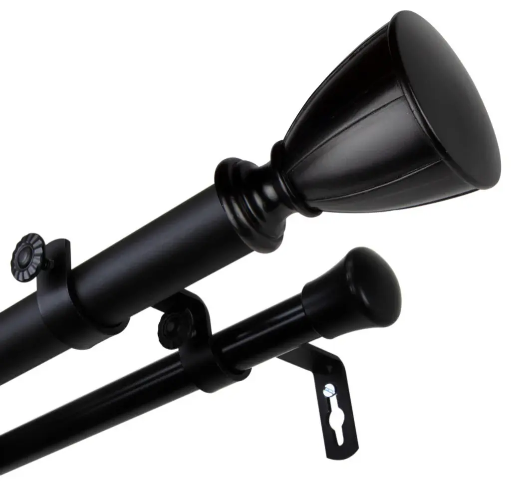 Black 1" Double Curtain Rod And Small Round End Cap Finials Set 120"-170"