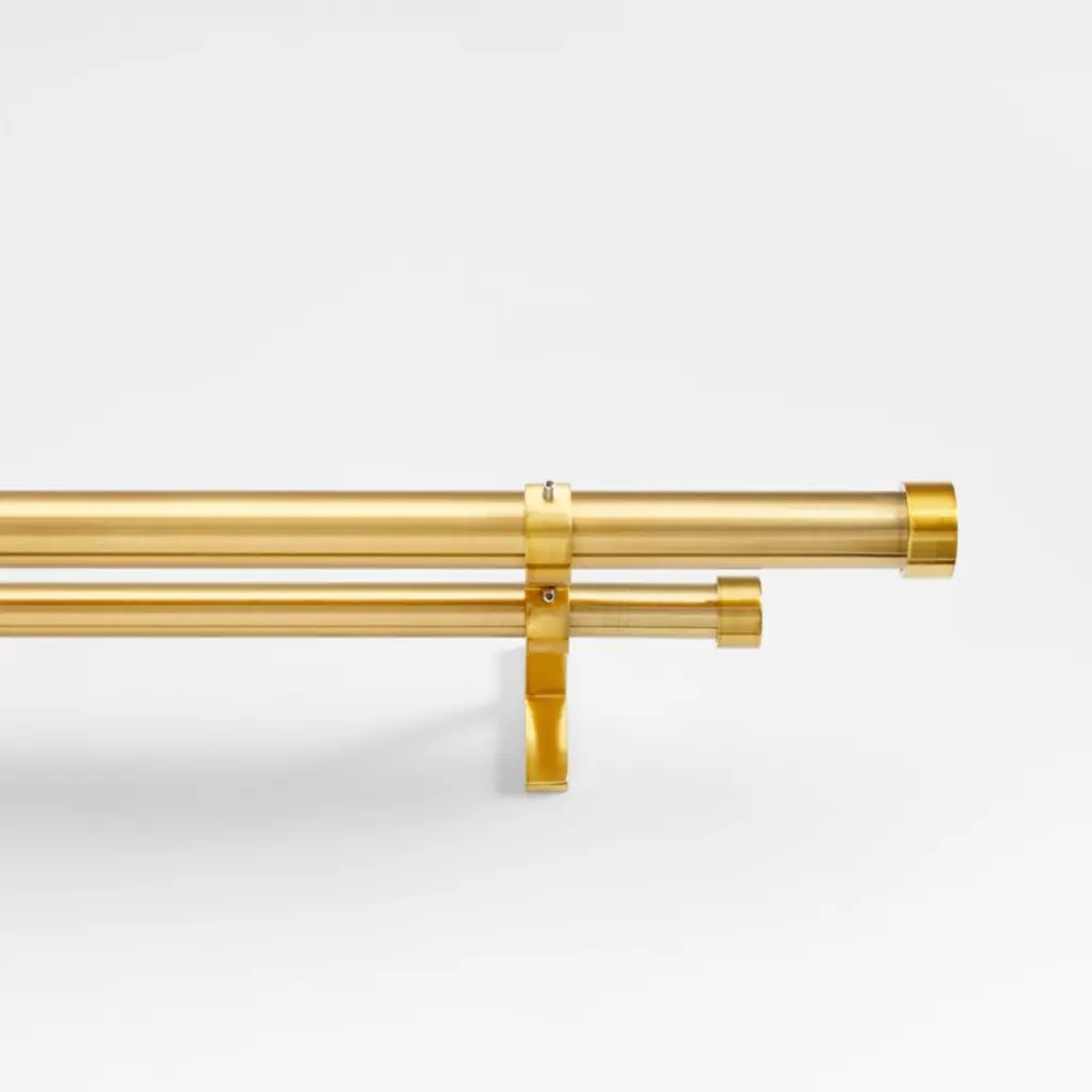 Show your curtains off to their best advantage with this modern rod set. Held in understated brackets, the round telescoping rod is finished at each end with button-shaped end cap finials that continue the cylindrical look. The curtain rod set includes a telescoping rod, brackets and mounting hardware, all in golden brass. Complete your window dressing with our brass curtain rings and tiebacks (sold separately).