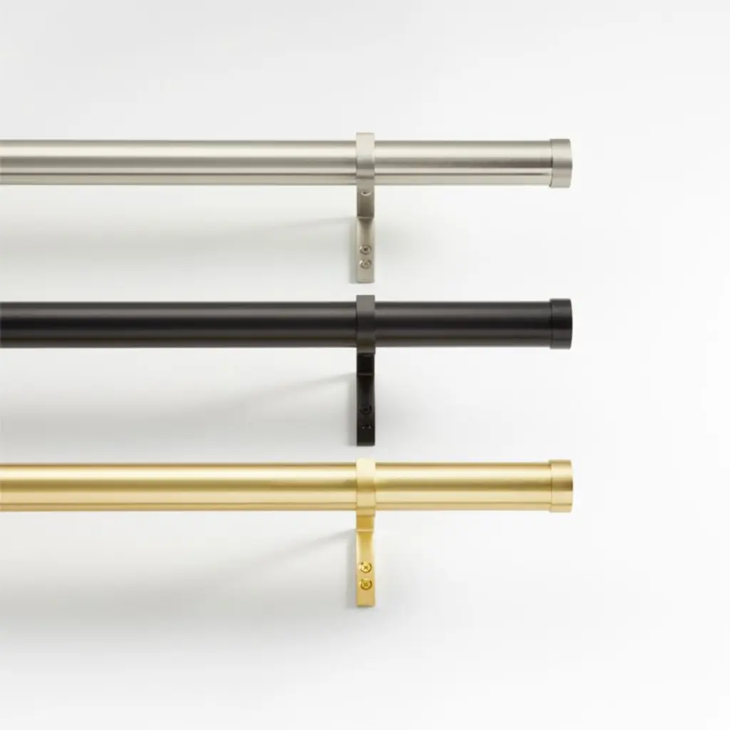 Show your curtains off to their best advantage with this modern rod set. Held in understated brackets, the round telescoping rod is finished at each end with button-shaped end cap finials that continue the cylindrical look. The curtain rod set includes a telescoping rod, brackets and mounting hardware, all in golden brass. Complete your window dressing with our brass curtain rings and tiebacks (sold separately).