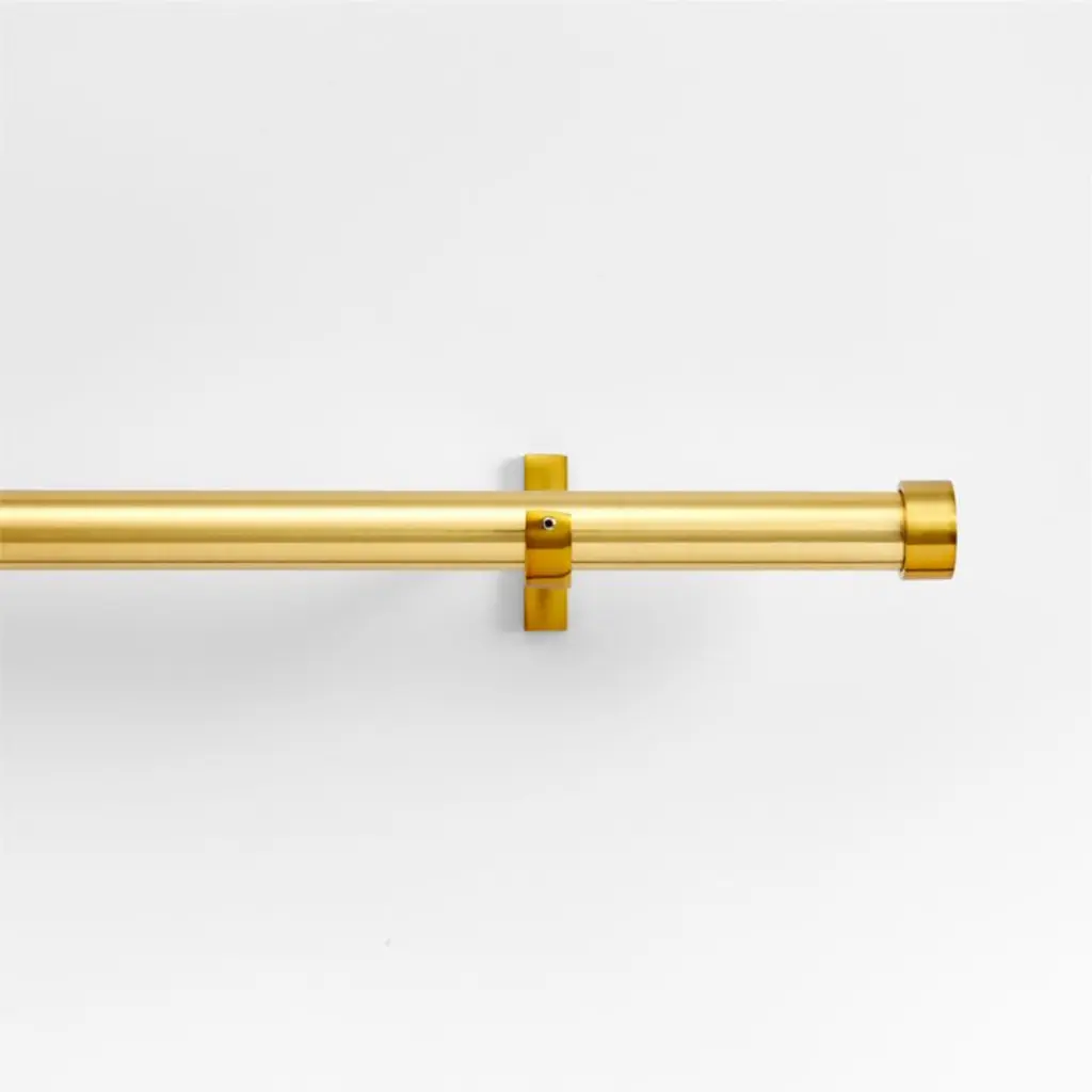 Show your curtains off to their best effect with this modern set. A slender telescoping rod is held in elegantly angular brackets and finished at each end with sleek cylindrical end caps. This set includes a telescoping rod, brackets and mounting hardware, all in glowing brass. Finish the look with any of our brass curtain rings and tiebacks for a well-dressed window with subtle shine.