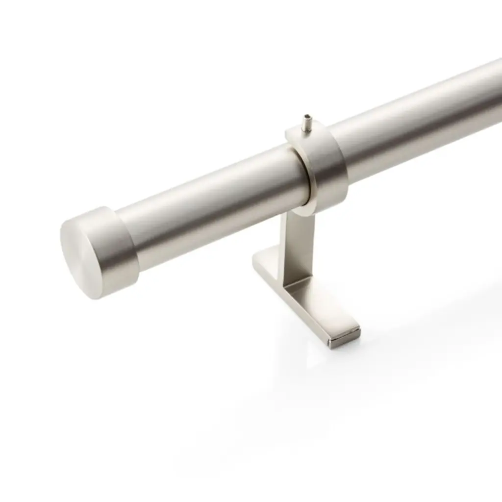 Show your curtains off to their best effect with this modern set. A slender rod is held in two elegantly angular brackets and finished at each end with sleek cylindrical end caps. This set includes a telescoping rod, brackets and mounting hardware, all in soft brushed nickel. Finish the look with any of our brushed nickel curtain rings and tiebacks for a polished window with subtle shine.