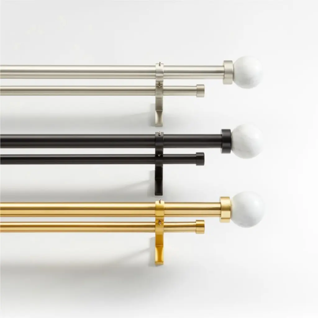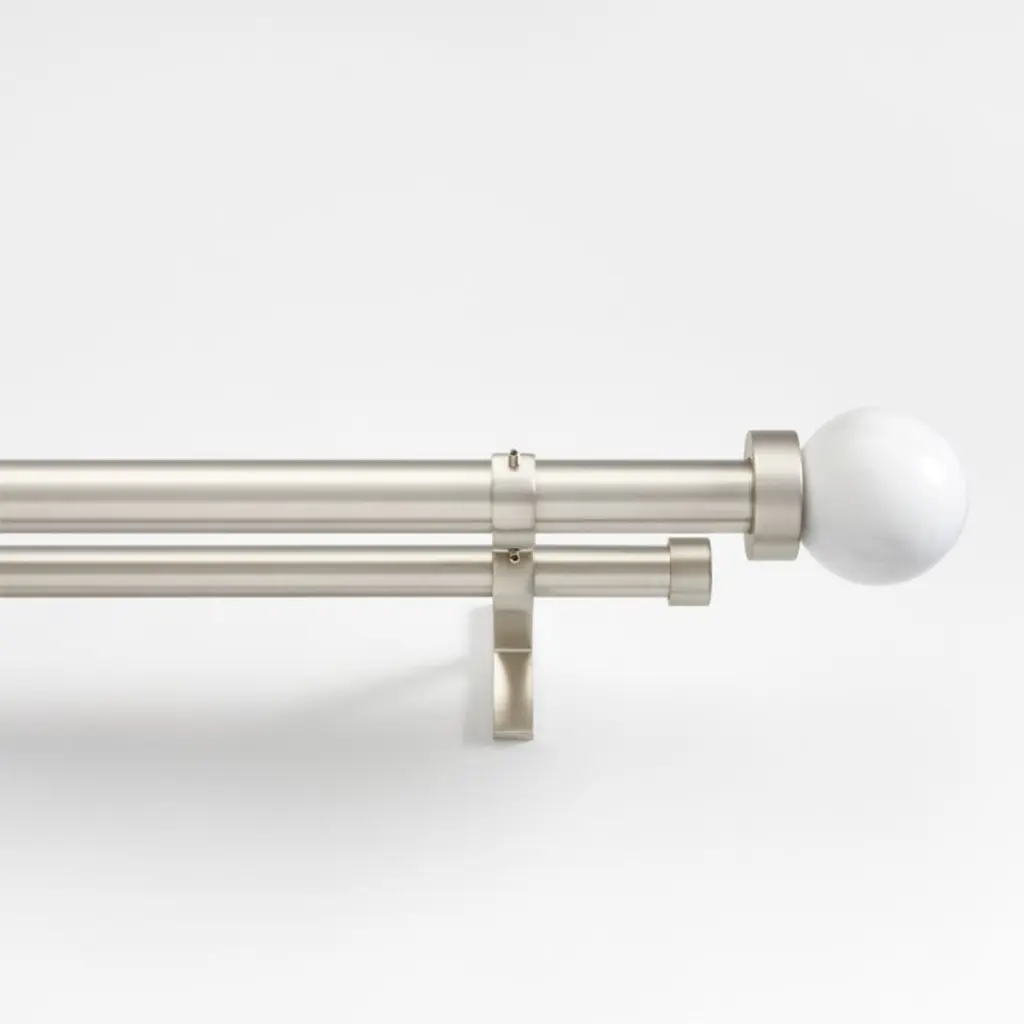 Our brushed nickel two-tier curtain rod set hangs both panels and sheers for a layered look, adjusting easily to your preferred levels of light and privacy. Simple yet statement-making, spheres of white marble round out your drapery with a luxe finishing touch, adding organic beauty to the slim curtain rods and understated brackets. This double curtain rod set includes telescoping rods, brackets and mounting hardware, all finished in brushed nickel. Complete your window dressing with our coordinating curtain rings and tiebacks (sold separately).