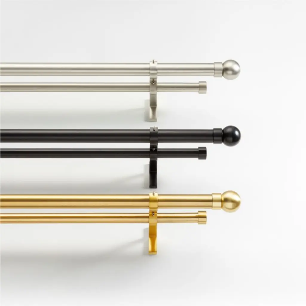 Our brushed nickel two-tier curtain rod set hangs both panels and sheers for a layered look, adjusting easily to your preferred levels of light and privacy. Small, subtly shining spheres punctuate your drapery with clean geometry, adding crisp definition to the slim curtain rods and understated brackets. This double curtain rod set includes telescoping rods, brackets and mounting hardware, all finished in brushed nickel. Complete your window dressing with our coordinating curtain rings and tiebacks (sold separately).