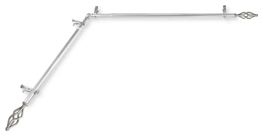 Easily and effortlessly decorate your corner windows with curtains. 1 set of two 13/16 inch diameter curtain rods attach via corner ball connector that allows for nearly 360 of rotation. These high quality steel rods are accented with decorative finial end pieces.Includes: two 13/16 inch diameter rods, 2 finials, 1 corner connectors, and mounting hardware.Finial Measurement: 2-1/2 inch W X 1-1/2 inch H x 1-1/2 inch DBracket Projection: 2.875 inchInstallation instructions includedSteel Rod and Resin Finial