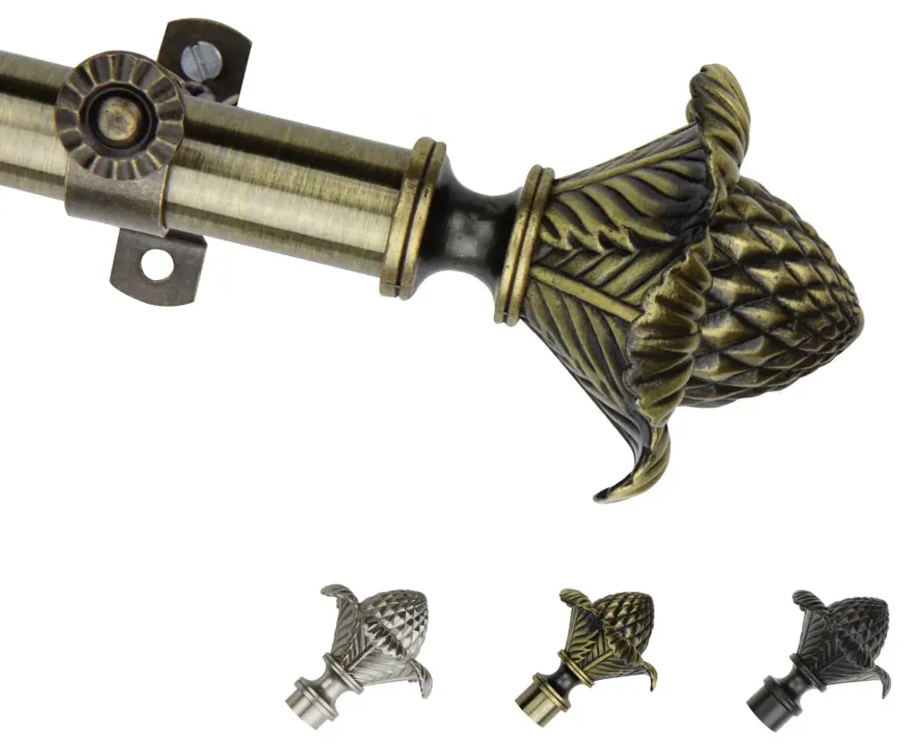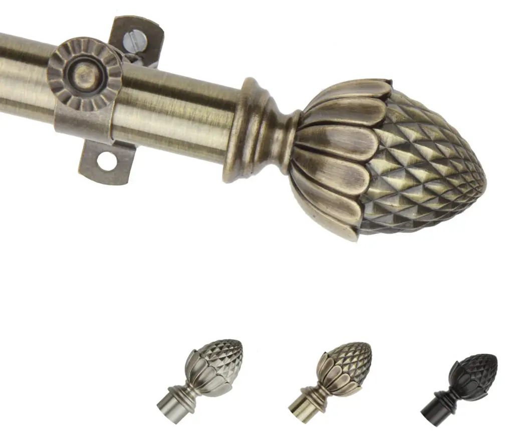 Decorate your window with this Rod Desyne Bud Curtain Rod. This rod is made of solid steel pole while lends a sophiscated touch and finished appeal to your window treatment, regardless of room or drapery style. Features:Includes one 13/16 inch diameter high quality steel telescoping pole, extends 28-48 inch, 2 brackets and 2 finialsEach Bud finial measures W 2.5 inches x H 1.5 inches x D 1.5 inchesProjection: 2.875"