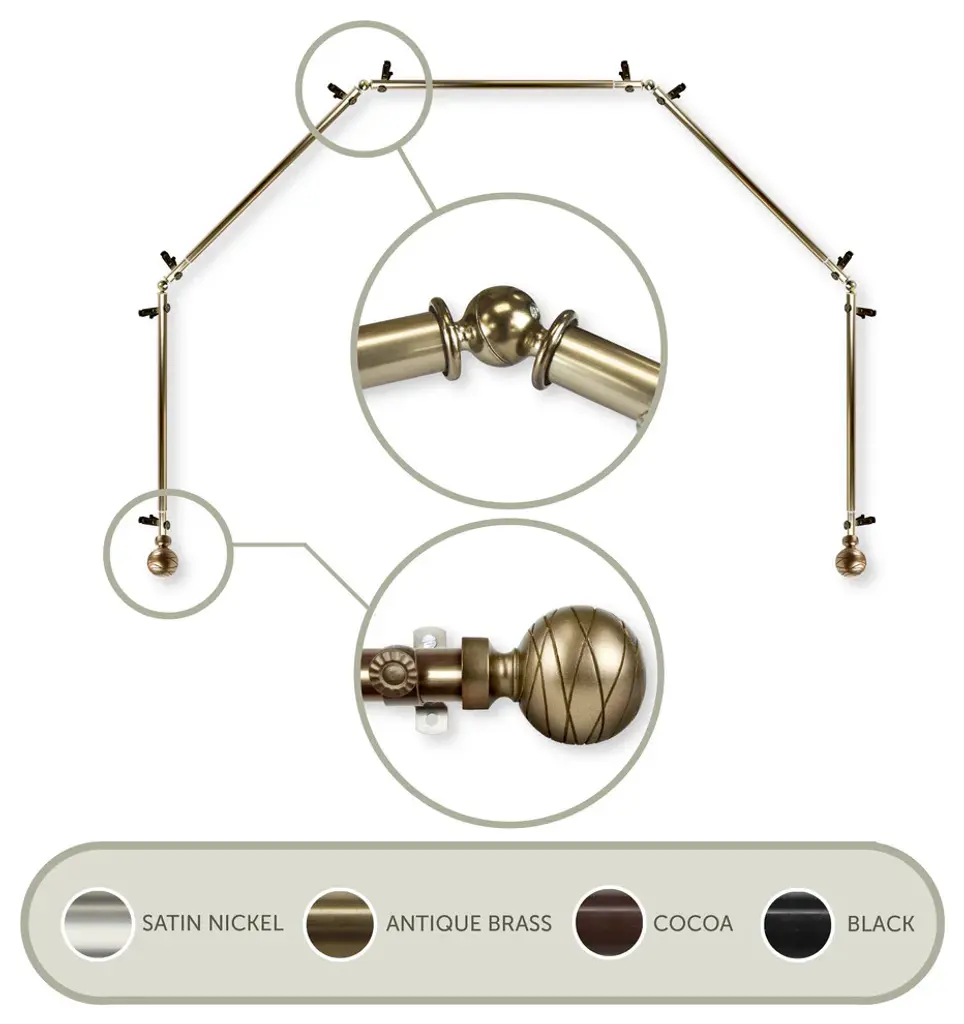 Easily and effortlessly decorate your corner windows with curtains. 1 set of two 13/16 inch diameter curtain rods attach via corner ball connector that allows for nearly 360 of rotation. These high quality steel rods are accented with decorative finial end pieces.Includes: two 13/16 inch diameter rods, 2 finials, 1 corner connectors, and mounting hardware.Finial Measurement: 2-1/2 inch W X 1-1/8 inch H x 1-1/8 inch DBracket Projection: 2.875 inchInstallation instructions includedSteel Rod and Resin Finial