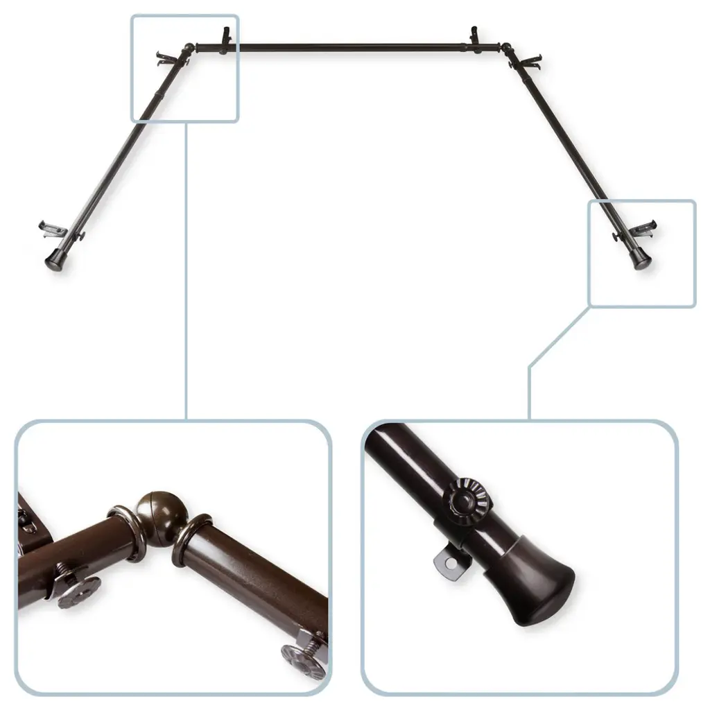Easily and effortlessly decorate your corner windows with curtains. 1 set of two 13/16 inch diameter curtain rods attach via corner ball connector that allows for nearly 360 of rotation. These high quality steel rods are accented with decorative finial end pieces.Includes: two 13/16 inch diameter rods, 2 finials, 1 corner connectors, and mounting hardware.Finial Measurement: 2-1/2 inch W X 1-1/8 inch H x 1-1/8 inch DBracket Projection: 2.875 inchInstallation instructions includedSteel Rod and Resin Finial