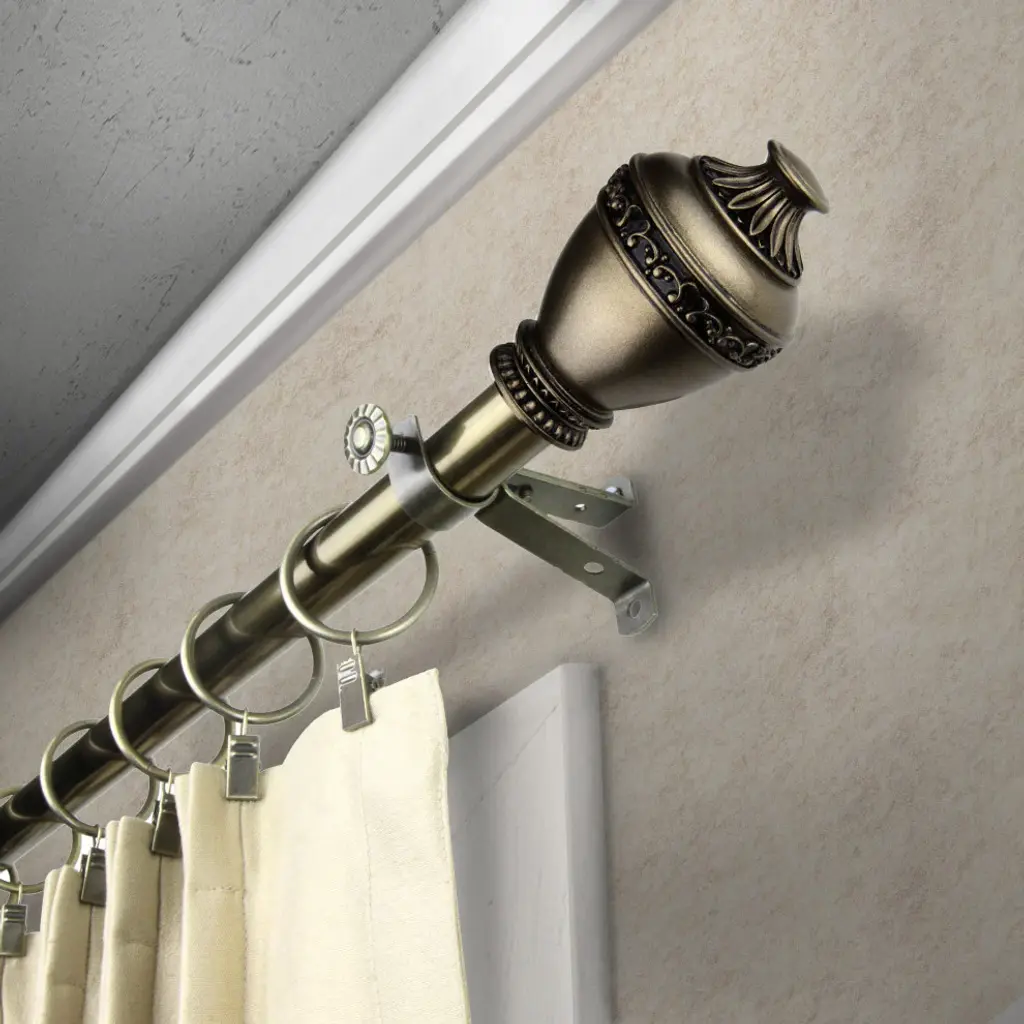 Introduce an elegant touch to your window treatment with this beautiful 13/16" diameter curtain rod set, made of high quality steel rods. Includes telescoping steel pole, mounting hardware, brackets, and 2 finials Projection: 2.875" Finial measurement: 3.25" W x 2.25" H x 2.25" D