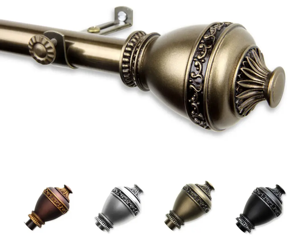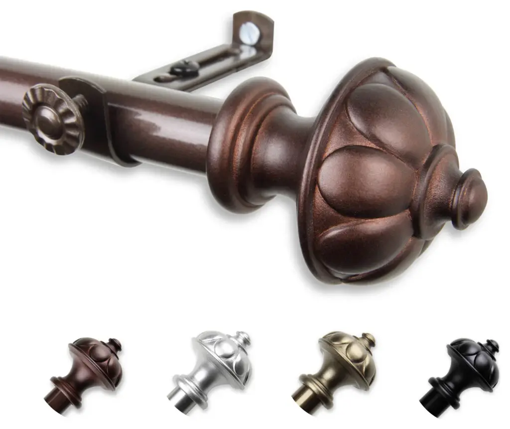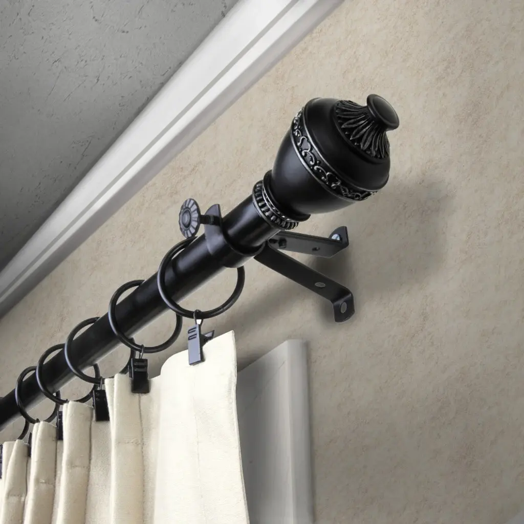 Introduce an elegant touch to your window treatment with this beautiful 13/16" diameter curtain rod set, made of high quality steel rods. Includes telescoping steel pole, mounting hardware, brackets, and 2 finials Projection: 2.875" Finial measurement: 3.25" W x 2.25" H x 2.25" D
