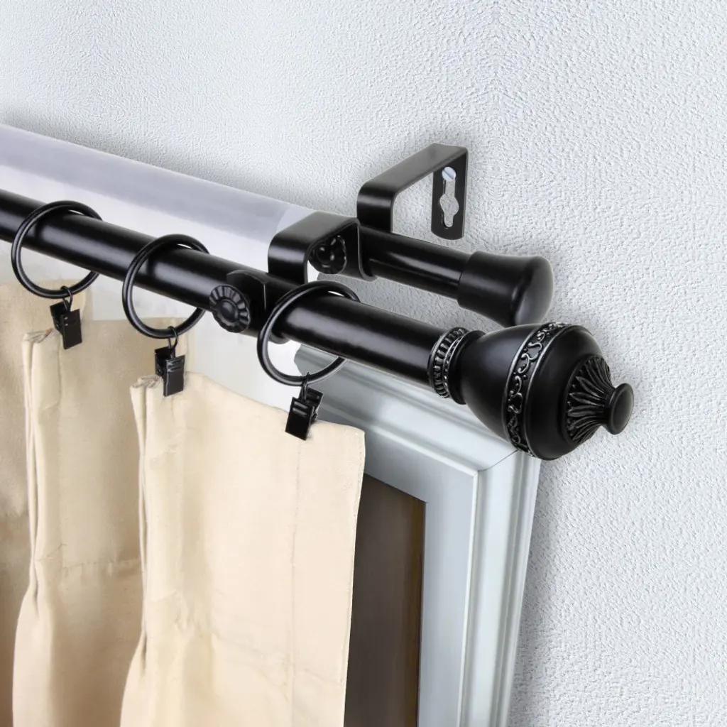Introduce an elegant touch to your window treatment with this beautiful 13/16" diameter double curtain rod set, made of high quality steel rods. Includes 2 telescoping steel pole, mounting hardware, brackets, and 2 finials Projection: 2.875" Finial measurement: 3.25" W x 2.25" H x 2.25" D