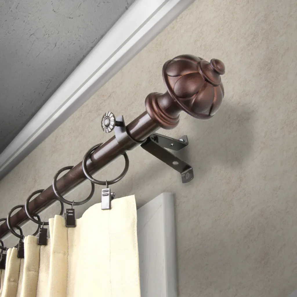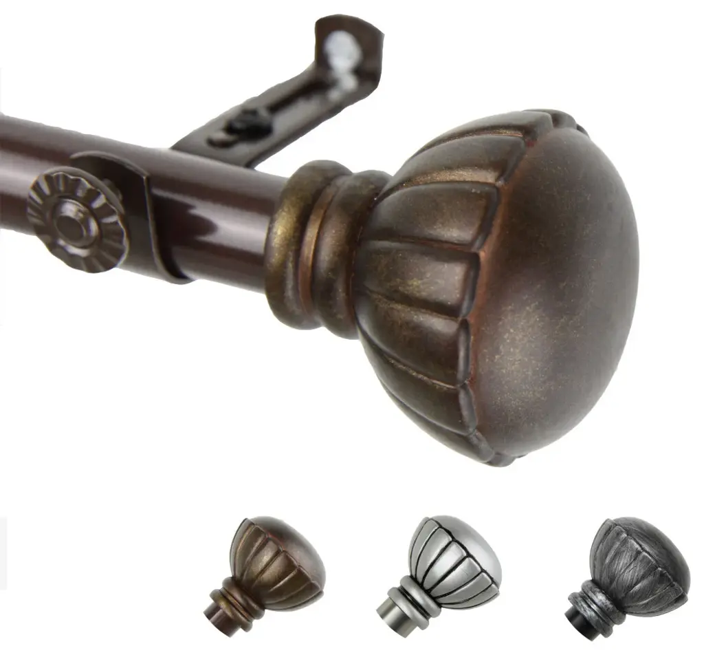 Introduce an elegant touch to your window treatment with this beautiful 13/16" diameter curtain rod set, made of high quality steel rods. Includes telescoping steel pole, mounting hardware, brackets, and 2 finials Projection: 2.875" Finial measurement: 2.5" W x 2" H x 2" D