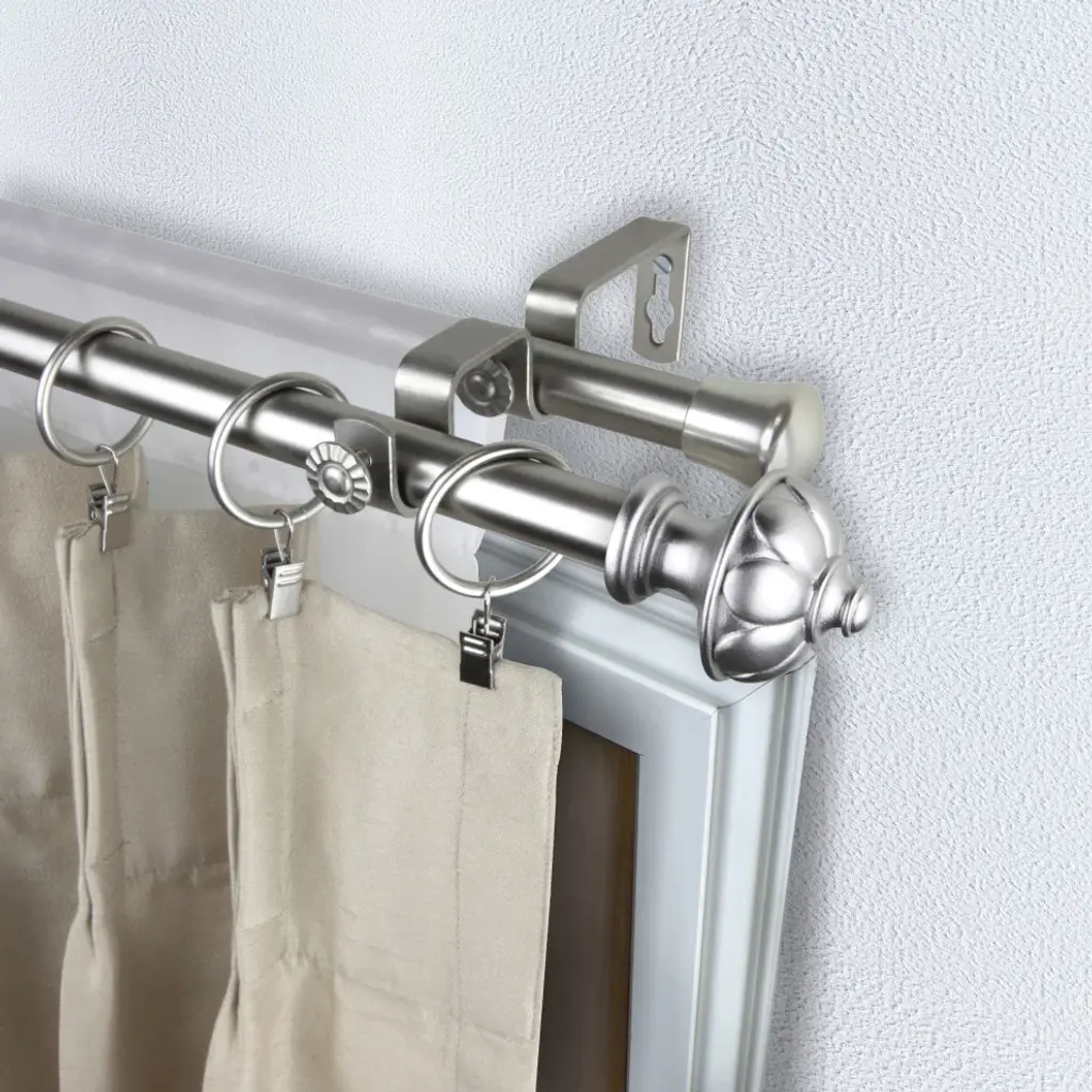 Introduce an elegant touch to your window treatment with this beautiful 13/16" diameter double curtain rod set, made of high quality steel rods. Includes 2 telescoping steel pole, mounting hardware, brackets, and 2 finials Projection: 2.875" Finial measurement: 2.5" W x 2" H x 2" D