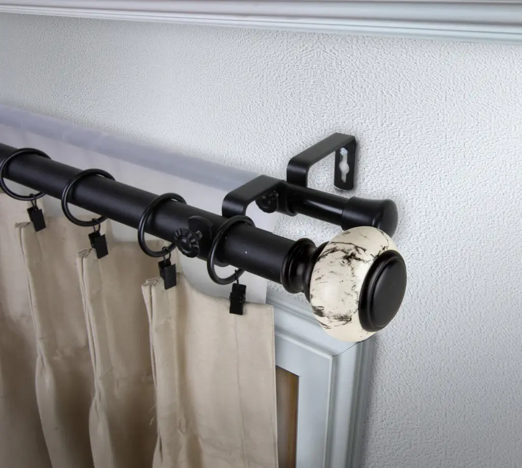 Decorate your window with Central Design Products Curtain Rod. This rod is made of solid steel pole with high quality finials that will add sophisticated touch to your windowIncludes two 66-120 inches telescoping steel pole 3 brackets and 2 finialsFinial Measurement: 2-3/4" W x 2-3/4" H x 3" DProjection: from rod to wall 6.75 inches back rod to wall 3.75 inchesRod Diameter: 1 inch