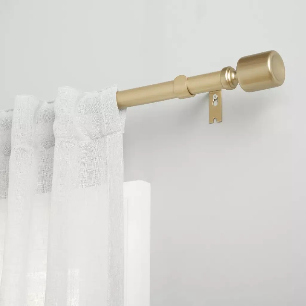The Exclusive Home Rino Window Curtain Rod and Finial Set in a gold finish offers an ultra-modern decorative accent for your window decor. The 1" diameter adjustable iron rod accommodates most window sizes and will support most curtain panels, from airy sheers to weighted blackout curtain panels with various tops. The modern cylinder resin finial design adds an eye-catching touch and will keep your curtains secure on the rod while providing the perfect finishing touch to your décor.