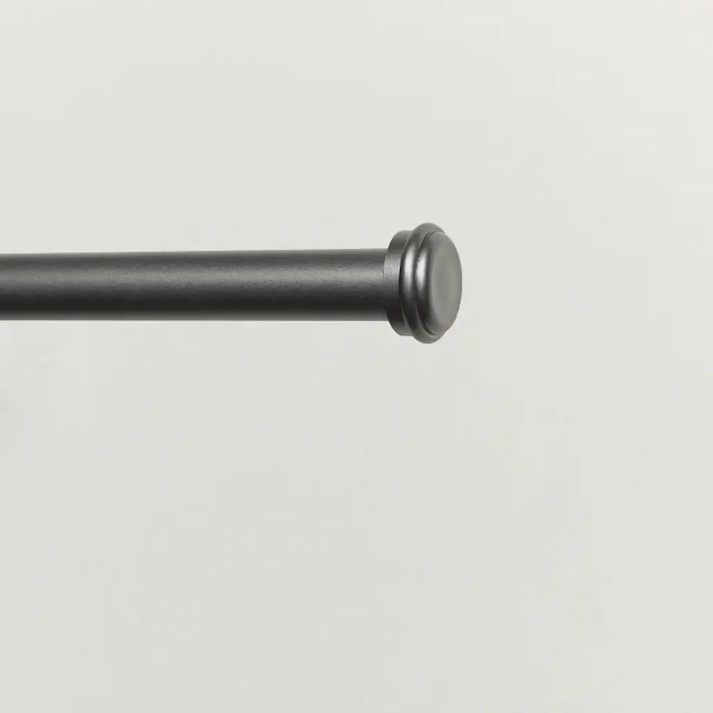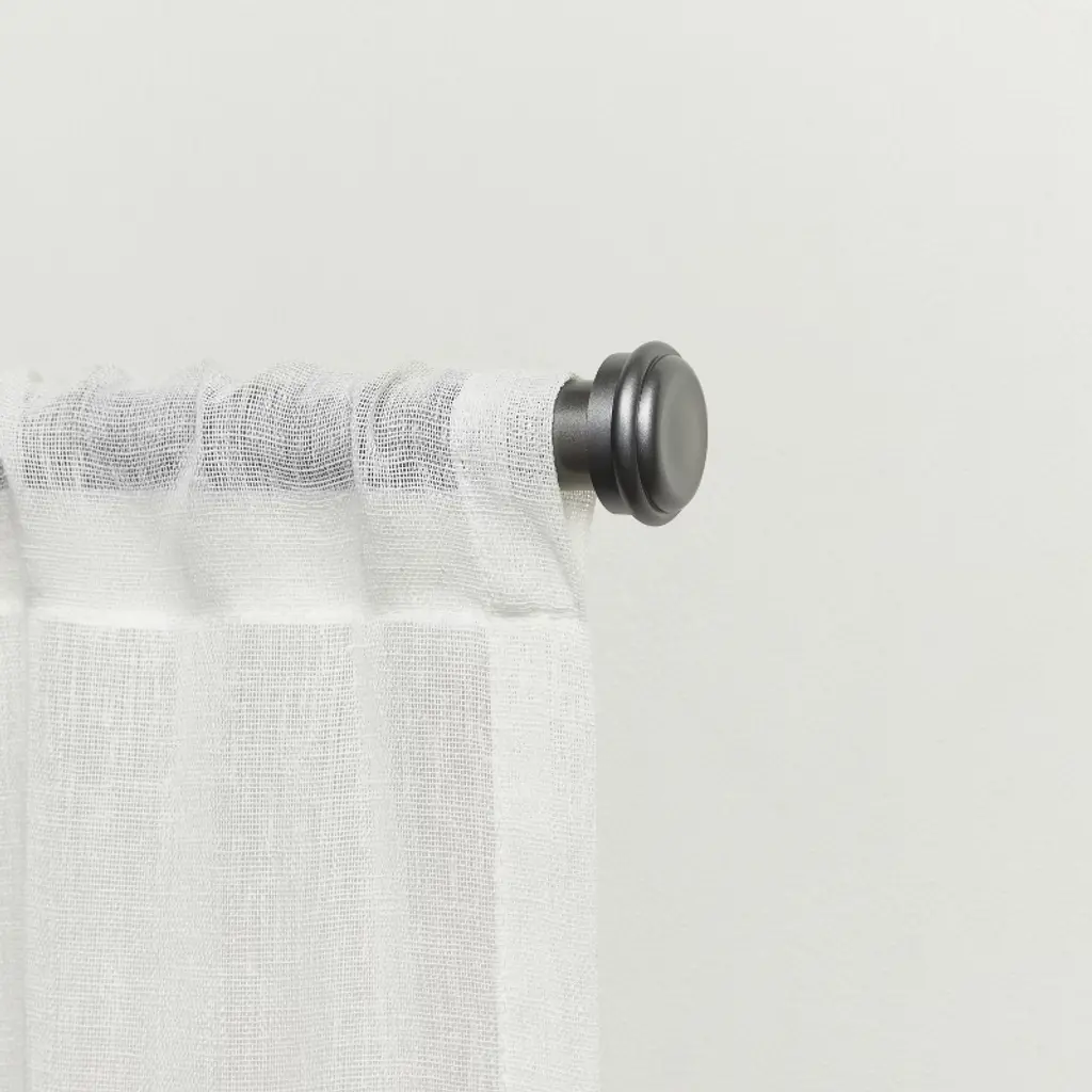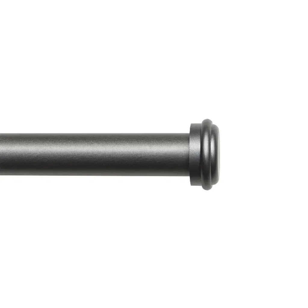 The Topper decorative curtain rod and finial set features a simple, classic style and traditional design with a matte finish iron rod and coordinating wood plastic button end cap finials. This set will provide a visually balanced appearance for your window treatments. The 1.6" diameter x 0.7" long finials will insure that your window curtain panels will remain securely on the rod. The 1" diameter iron adjustable curtain rod is designed to fit a wide range of window widths, and has a sturdy 25 lb. capacity that will support flowing sheers to thermal blackout panels. The 3.5" fixed depth projection bracket provides a gracious amount of space for fabrics to drape perfectly. Accommodates window curtain panels and drapes that are designed with various tops, including: rod pocket, pinch pleat, clip rings, grommets, tab top, or hidden back tab top. Provides an attractive accent to every window treatment in your living room, bed room, bathroom, kitchen, and kids room. Installs easily with included hardware and installation instructions. Sturdy, easy clean, no fuss, wipe clean finish will last for lifetime. This window curtain rod and finial set will add the perfect finish accent to any window treatment and adds a refined style to your home decor.