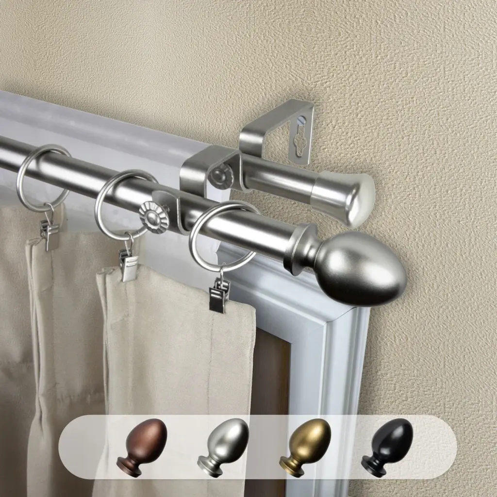 Central Design Products presents the perfect enhancement to your window treatment with high-end quality Double Curtain Rods. Designed to add a modern touch to any window. Includes 2 curtain rods of 13/16" diameter, 3 brackets, and mounting hardware. Projection: 6.375" Front rod to wall, 3.75" Back rod to wall Rod Diameter: 13/16" Material: Steel Color: Satin Nickel