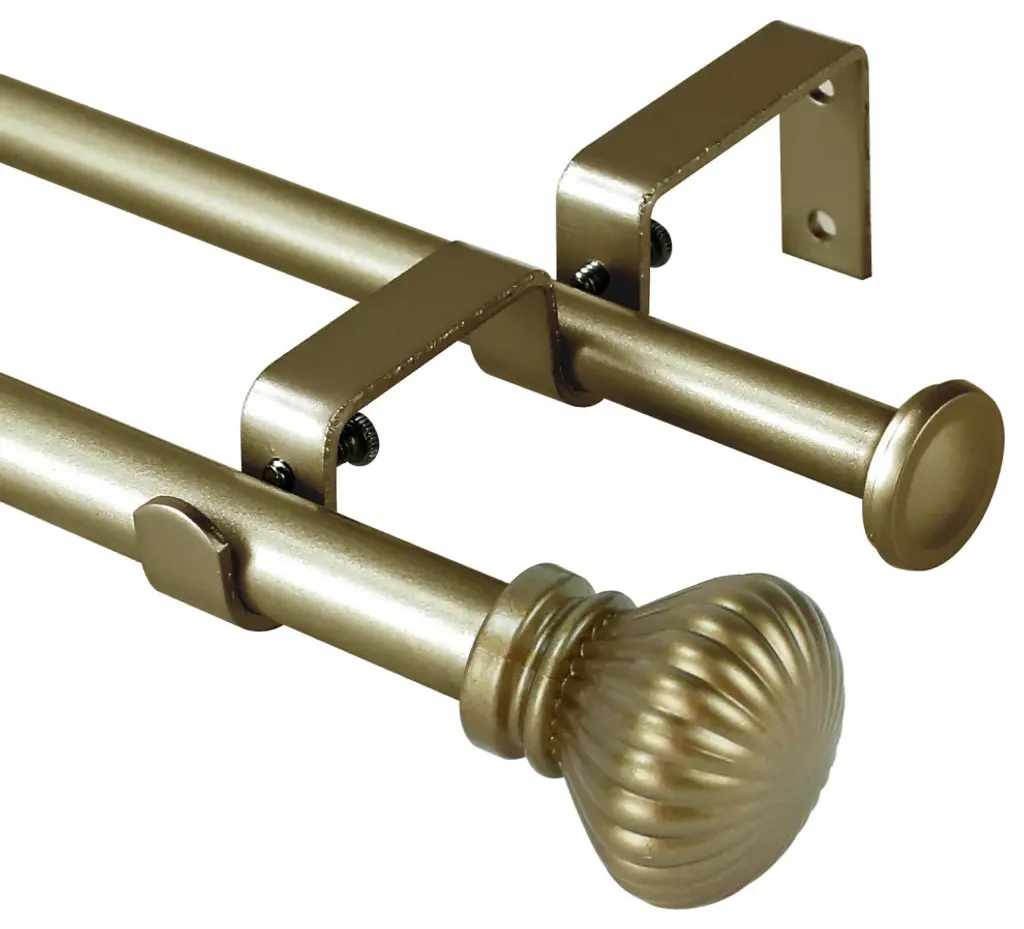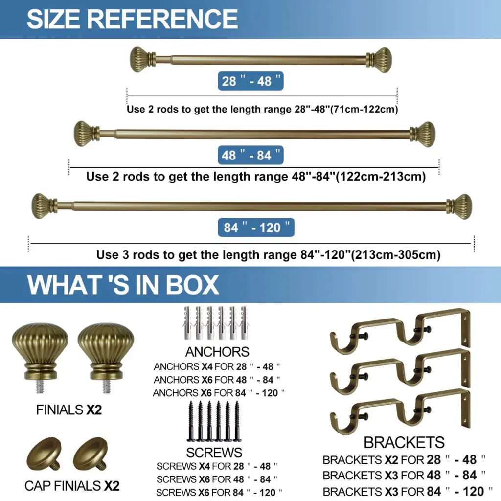 The rod set includes 2 rods, 2 sets of two finials, and double brackets in an antique gold finishThe front adjustable curtain rod measures 5/8" diameter and comes with fluted ball finials; the back adjustable curtain rod measures 1/2" diameter and comes with flat button shaped finials. Both rods extend from 24" to 48".Two matching double brackets included. Both brackets measure 5" long, 2 1/2" to center of first bracket cup, and 5" to center of second bracket cup. 1 1/2" wall mount span.Available in 5 finishes: Black, Glossy White, Bronze, Pewter, and Antique GoldMounting hardware included for easy installation.