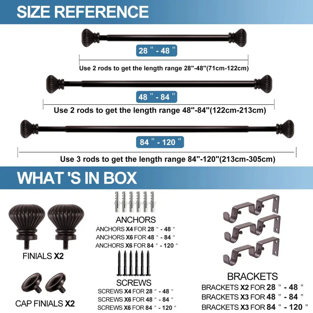 The rod set includes 2 rods, 2 sets of two finials, and double brackets in a bronze finishThe front adjustable curtain rod measures 5/8" diameter and comes with fluted ball finials; the back adjustable curtain rod measures 1/2" diameter and comes with flat button shaped finials. Both rods extend from 84" to 120".Three matching double brackets included. All brackets measure 5" long, 2 1/2" to center of first bracket cup, and 5" to center of second bracket cup. 1 1/2" wall mount span.Available in 5 finishes: Black, Glossy White, Bronze, Pewter, and Antique GoldMounting hardware included for easy installation.