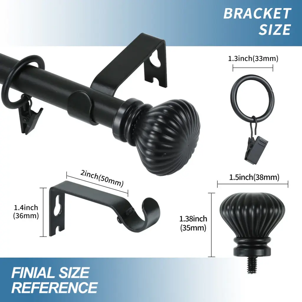 The rod set includes 1 rod, 1 set of two finials, matching curtain rings, and brackets in a black finish.The adjustable curtain rod measures 5/8" diameter and comes with fluted ball finials. The rod extends from 48" to 84".Three matching brackets included. All brackets measures 3" long, 2 1/2" to center bracket cup; 1 1/2" wall mount span. Includes 16 rings with clips and eyelets.Available in 5 finishes: Black, Glossy White, Bronze, Pewter, and Antique GoldMounting hardware included for easy installation.