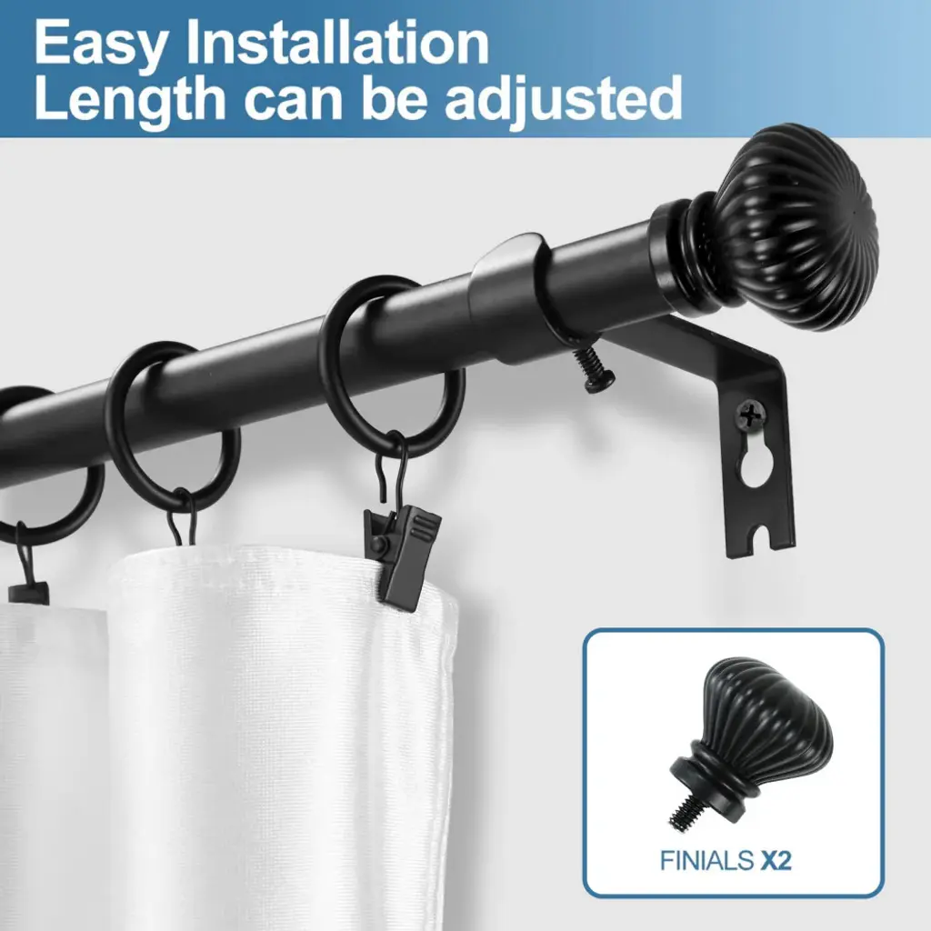 Fluted Ball Adjustable Single Curtain Rod Set With Rings, 5/8", Black, 48"-84"