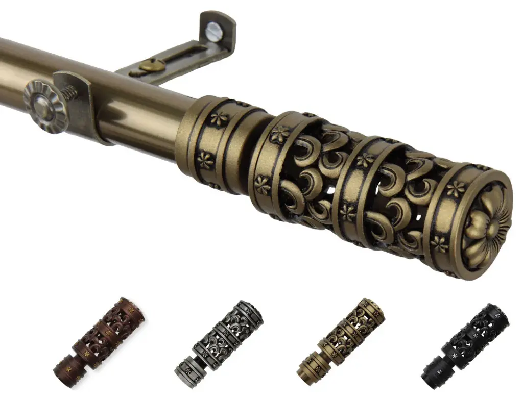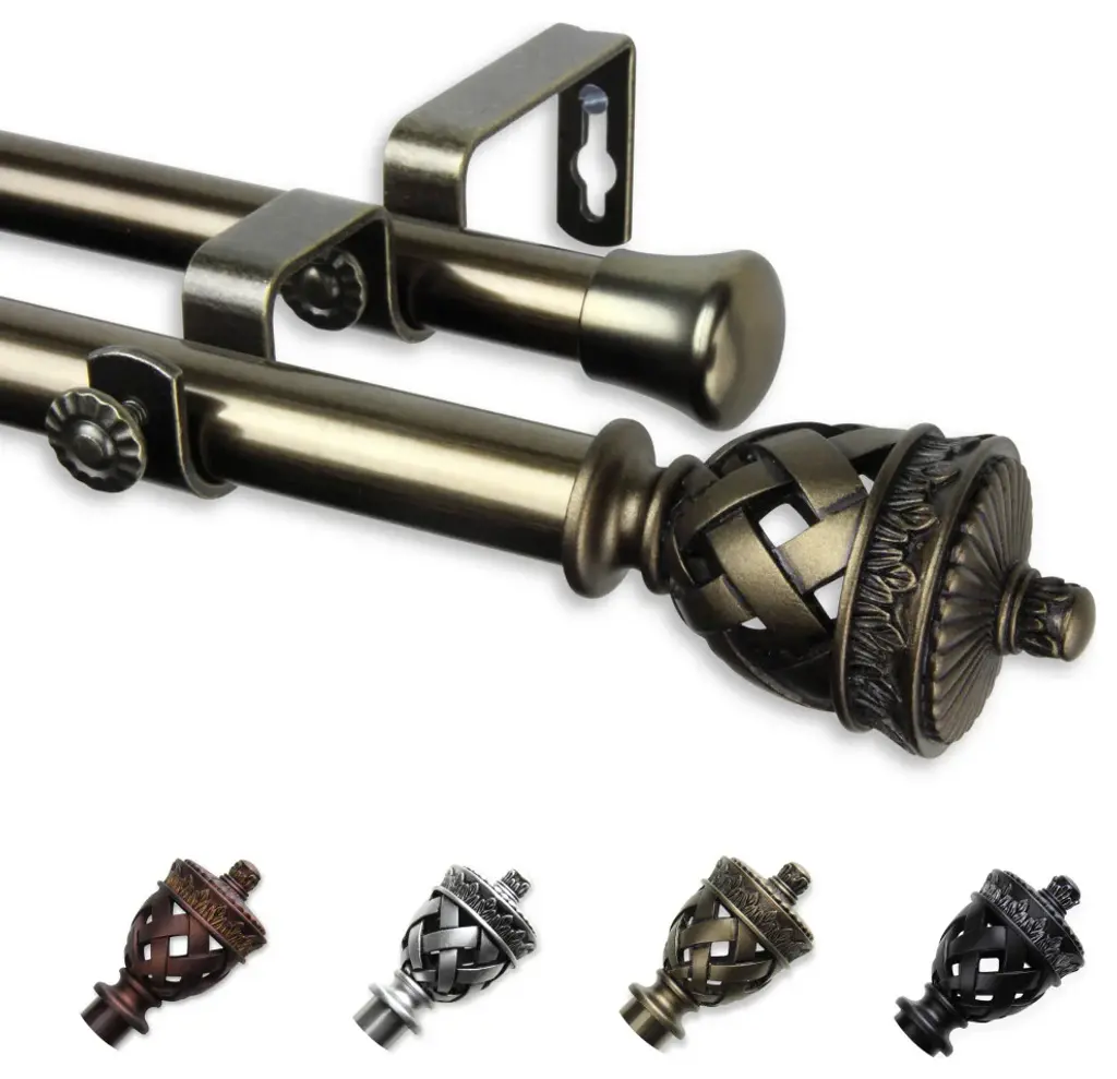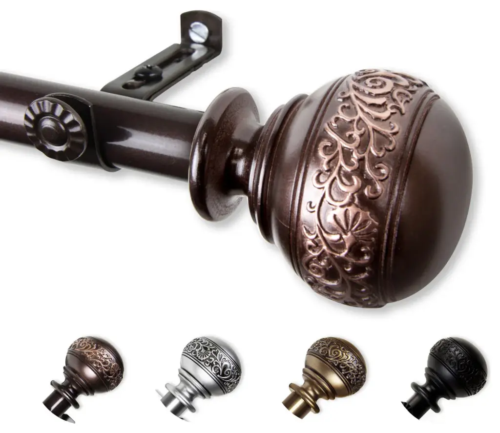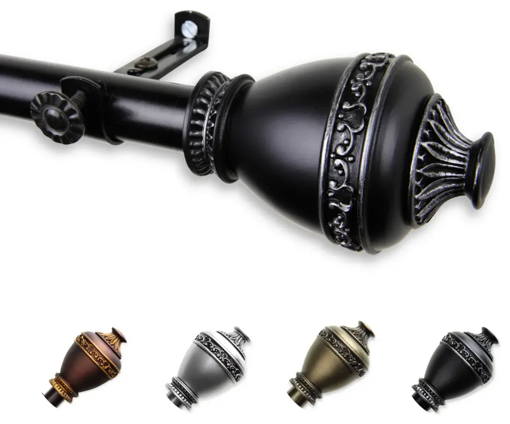 Introduce an elegant touch to your window treatment with this beautiful 13/16" diameter curtain rod set, made of high quality steel rods. Includes telescoping steel pole, mounting hardware, brackets, and 2 finials Projection: 2.875" Finial measurement: 3" W x 1.75" H x 1.75" D
