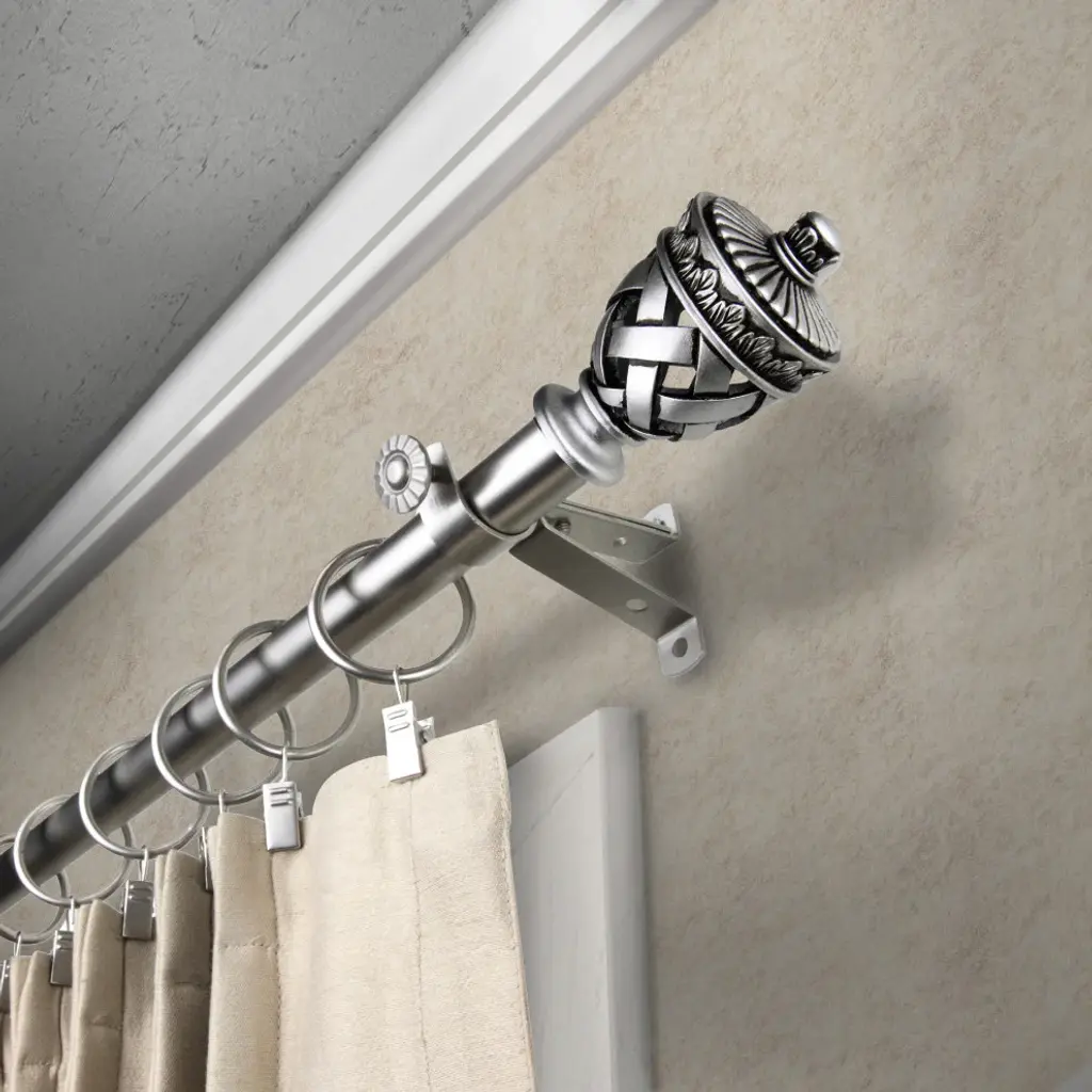 Introduce an elegant touch to your window treatment with this beautiful 13/16" diameter curtain rod set, made of high quality steel rods. Includes telescoping steel pole, mounting hardware, brackets, and 2 finials Projection: 2.875" Finial measurement: 3" W x 1.75" H x 1.75" D