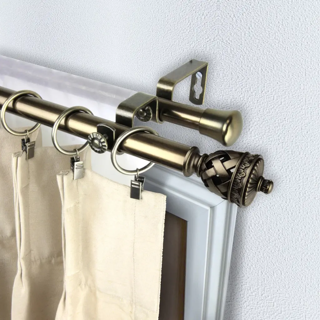 Introduce an elegant touch to your window treatment with this beautiful 13/16" diameter double curtain rod set, made of high quality steel rods. Includes 2 telescoping steel pole, mounting hardware, brackets, and 2 finials Projection: 2.875" Finial measurement: 3" W x 1.75" H x 1.75" D