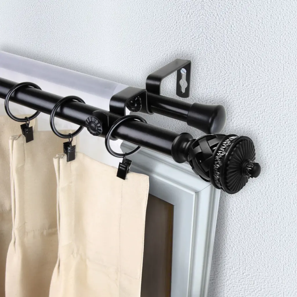 Introduce an elegant touch to your window treatment with this beautiful 13/16" diameter double curtain rod set, made of high quality steel rods. Includes 2 telescoping steel pole, mounting hardware, brackets, and 2 finials Projection: 2.875" Finial measurement: 3" W x 1.75" H x 1.75" D