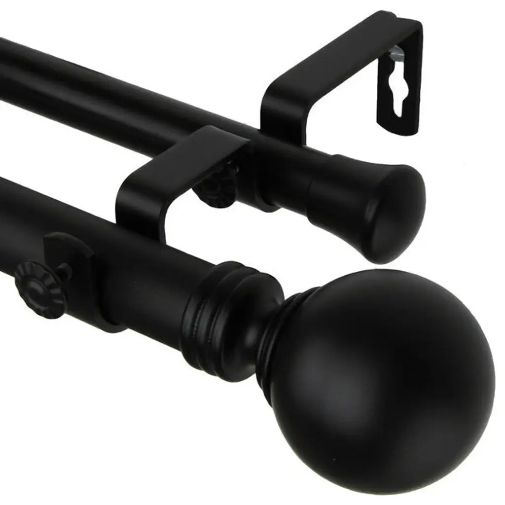 Decorate your window with this Rod Desyne Globe Double Curtain Rod. This rod is made of solid steel pole while lends a sophiscated touch and finished appeal to your window treatment, regardless of room or drapery style. Features:Includes one 1 inch diameter high quality steel telescoping front rod and one 13/16 inch diameter back rod, extends 66-120 inch, 3 brackets and 2 finialsEach Globe finial measures W 3 inches x H 2-3/8 inches x D 2-3/8 inchesProjection: wall to back rod: 3.75", wall to front rod: 6.75"