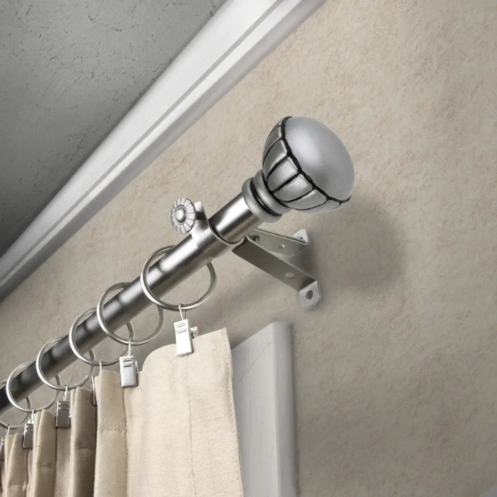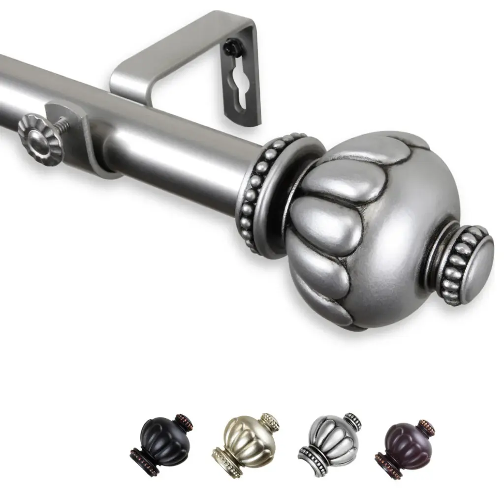 Introduce an elegant touch to your window treatment with this beautiful 13/16" diameter curtain rod set, made of high quality steel rods. Includes telescoping steel pole, mounting hardware, brackets, and 2 finials Projection: 2.875" Finial measurement: 2.5" W x 2.125" H x 2.125" D