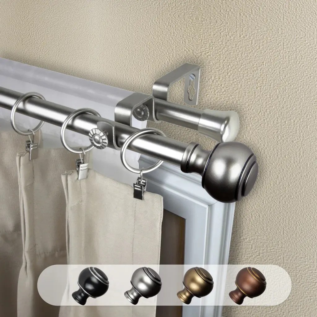Central Design Products presents the perfect enhancement to your window treatment with high-end quality Double Curtain Rods. Designed to add a modern touch to any window. Includes 2 curtain rods of 13/16" diameter, 3 brackets, and mounting hardware. Projection: 6.375" Front rod to wall, 3.75" Back rod to wall Rod Diameter: 13/16" Material: Steel Color: Satin Nickel
