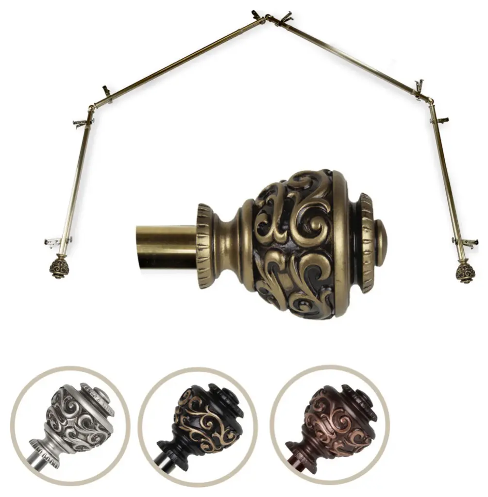 Add a sophisticated touch to your bay window treatment with a 13/16" diameter 4 part bay window curtain rod set. Made of high quality steel rods and resin finials. Includes four 28-48 inches; 8 brackets; 2 finials.Projection: 2.875 inchesFinial measurement: 2.875" W x 2.5" H x 2.5" DRod Diameter: 13/16 inch