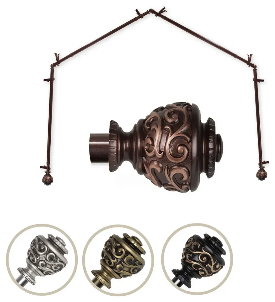 Add a sophisticated touch to your bay window treatment with a 13/16" diameter 4 part bay window curtain rod set. Made of high quality steel rods and resin finials. Includes four 28-48 inches; 8 brackets; 2 finials.Projection: 2.875 inchesFinial measurement: 2.875" W x 2.5" H x 2.5" DRod Diameter: 13/16 inch