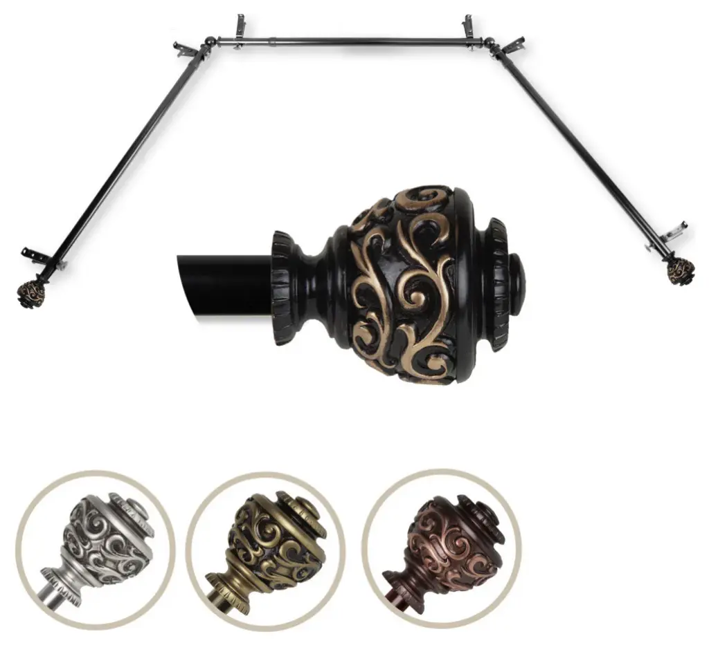 Add a sophisticated touch to your bay window treatment with a 13/16" diameter bay window curtain rod set. Made of high quality steel rods and resin finials. Includes one center rod 38-72 inches; two side rod 20-36 inches each; 6 brackets; 2 finials.Projection: 2.875"Finial measurement: 2.875" W x 2.5" H x 2.5" DRod Diameter: 13/16 inch