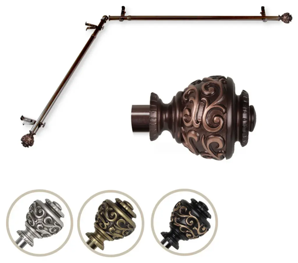 Add a sophisticated touch to your window treatment with a 13/16" diameter corner window curtain rod set. Made of high quality steel rods and resin finials.Includes two 66-120 inches telescoping steel pole 6 brackets and 2 finials.Projection: 2.875"Finial measurement: 2.875" W x 2.5" H x 2.5" DRod Diameter: 13/16 inch