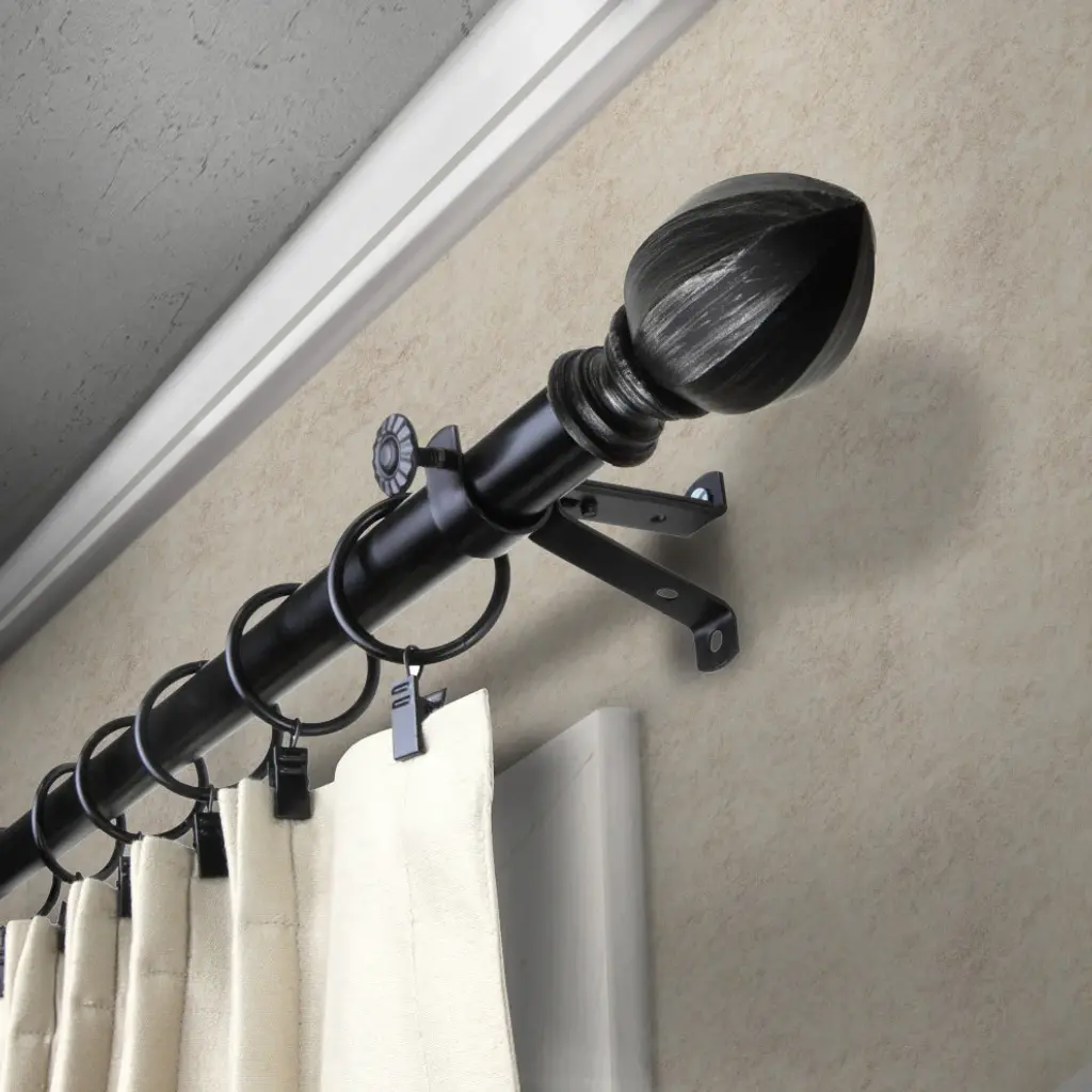 Introduce an elegant touch to your window treatment with this beautiful 13/16" diameter curtain rod set, made of high quality steel rods. Includes telescoping steel pole, mounting hardware, brackets, and 2 finials Projection: 2.875" Finial measurement: 3" W x 1.75" H x 1.75" D
