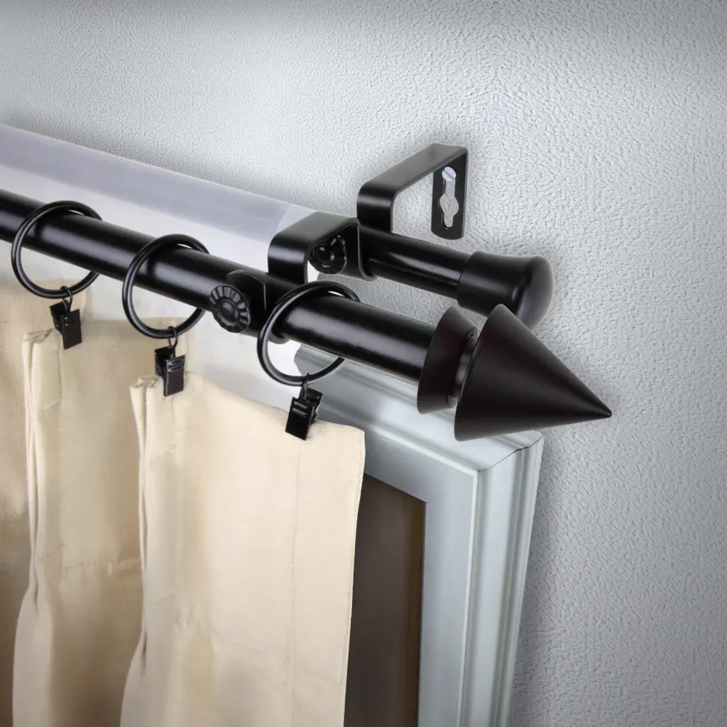 Introduce an elegant touch to your window treatment with this beautiful 13/16" diameter double curtain rod set, made of high quality steel rods. Includes 2 telescoping steel pole, mounting hardware, brackets, and 2 finials Projection: 2.875" Finial measurement: 2.5" W x 2" H x 2" D