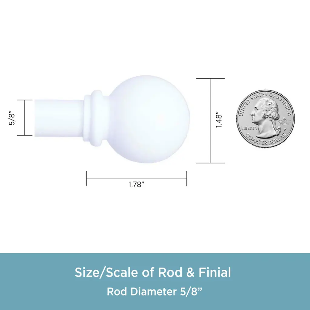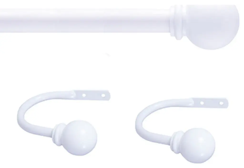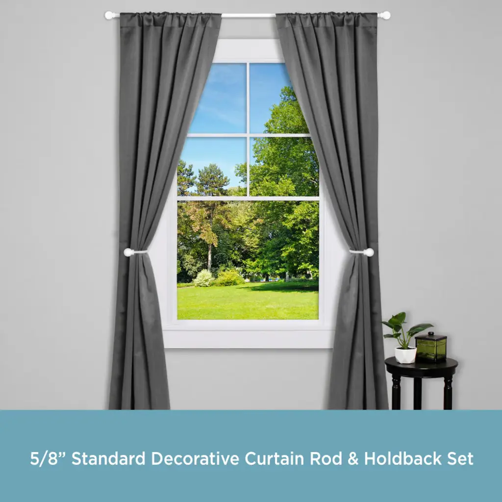 "Add a touch of style to your home with the Chelsea Decorative Curtain Rod & Holdback Set by Kenney.The 5/8 inch diameter Chelsea curtain rod in white features matching decorative finial ends. Use in your bedroom or living room to hang light to medium-weight curtains. The telescoping rod adjusts from 28 inches to 48 inches to fit your window and projects 3.5 inches from the wall. It is ideal for hanging curtains with pockets, grommets, back tabs, and tab tops, but can also be used with clip rings. Pair with the included beautiful and functional holdbacks help to frame your window and let light in. Set Includes: one telescoping steel curtain rod with decorative finials (1.78"" L x 1.48"" W x 1.48"" H), two decorative holdbacks (8"" L x 6"" W x 1.25"" H), two mounting brackets, screws, drywall anchors, and installation instructions. • The Kenney® Chelsea 5/8"" Standard Decorative Window Curtain Rod features decorative finials• 5/8"" diameter curtain rod adjusts from 28-48"" to fit your window and projects 3.5"� from the wall• For use with light to medium weight curtains in your bedroom or living room• Included holdbacks frame window to let light in• Each holdback measures 8"" L x 6"" W x 1.25"" H• Steel rod and holdbacks with decorative finials and matching mounting hardware• Includes: one telescoping curtain rod with finials, two holdbacks, two brackets, screws, drywall anchors, and installation instructions"