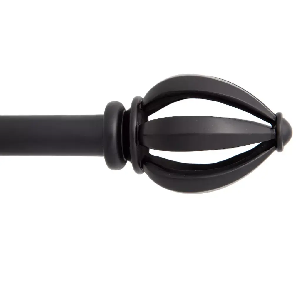 -Add a touch of style to your home with the Lucas Standard Decorative Window Curtain Rod by Kenney. The 3/4 inch diameter Lucas curtain rod in black features larger openwork cage finials to make a bolder statement. Use on larger windows and in larger rooms, like your bedroom and living room, to hang light to heavyweight curtains. The telescoping rod adjusts from 36 inches to 66 inches or from 66 inches to 120 inches to fit your window and projects 3.5 inches from the wall. It is ideal for hanging curtains with pockets, grommets, back tabs, and tab tops, but can also be used with clip rings. Drapery Hardware Set Includes: one telescoping steel curtain rod with decorative finials (3.22" L x 2.25" W x 2.25" H), two mounting brackets, one center support, screws, drywall anchors, and installation instructions.