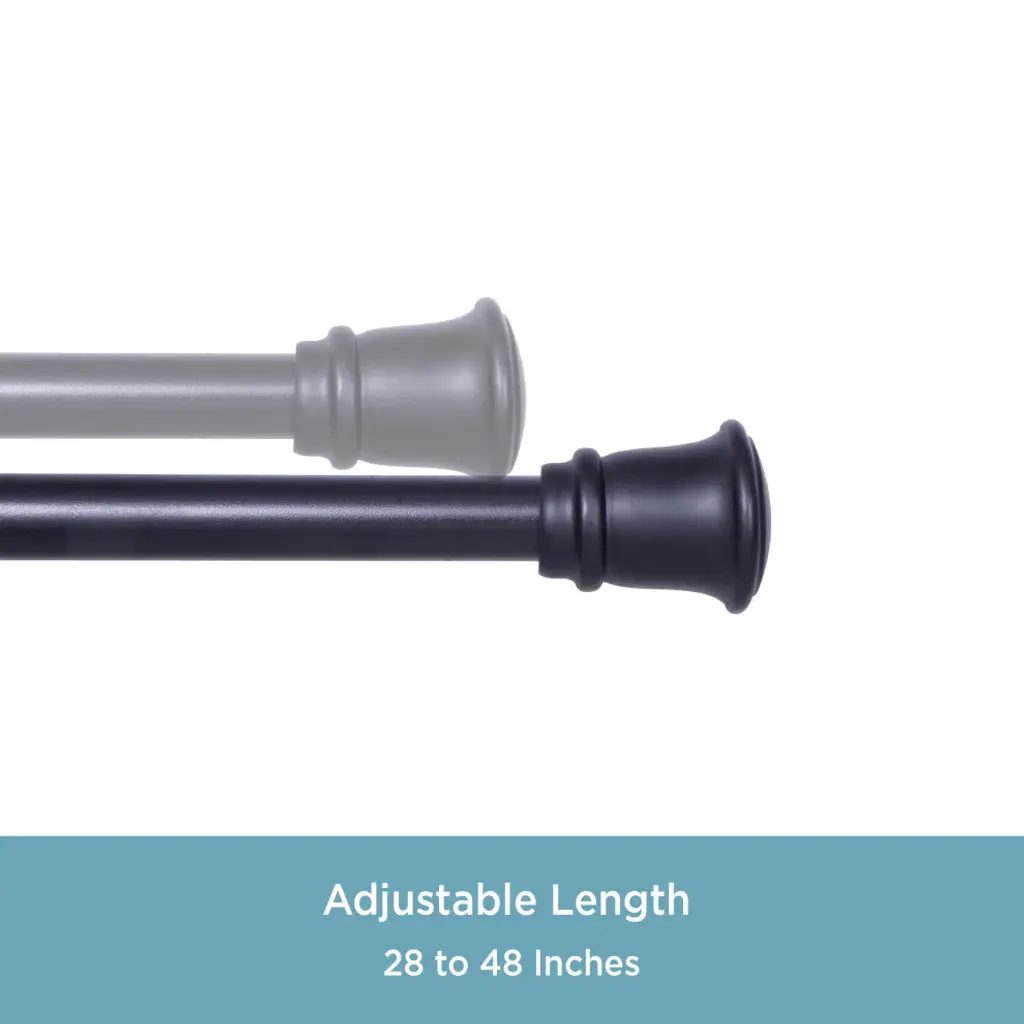 "Add a touch of style to your home with the Trumpet Decorative Curtain Rod & Holdback Set by Kenney.The 5/8 inch diameter Trumpet curtain rod in black features matching decorative finial ends. Use in your bedroom or living room to hang light to medium-weight curtains. The telescoping rod adjusts from 28 inches to 48 inches to fit your window and projects 2.68 inches from the wall. It is ideal for hanging curtains with pockets, grommets, back tabs, and tab tops, but can also be used with clip rings. Pair with the included beautiful and functional holdbacks help to frame your window and let light in. Set Includes: one telescoping steel curtain rod with decorative finials (1.66"" L x 1.42"" W x 1.42"" H), two decorative holdbacks (8"" L x 6"" W x 1.25"" H), two mounting brackets, screws, drywall anchors, and installation instructions. • The Kenney® Trumpet 5/8"" Standard Decorative Window Curtain Rod features decorative finials• 5/8"" diameter curtain rod adjusts from 28-48"" to fit your window and projects 2.68"� from the wall• For use with light to medium weight curtains in your bedroom or living room• Included holdbacks frame window to let light in• Each holdback measures 8"" L x 6"" W x 1.25"" H• Steel rod and holdbacks with decorative finials and matching mounting hardware• Includes: one telescoping curtain rod with finials, two holdbacks, two brackets, screws, drywall anchors, and installation instructions"