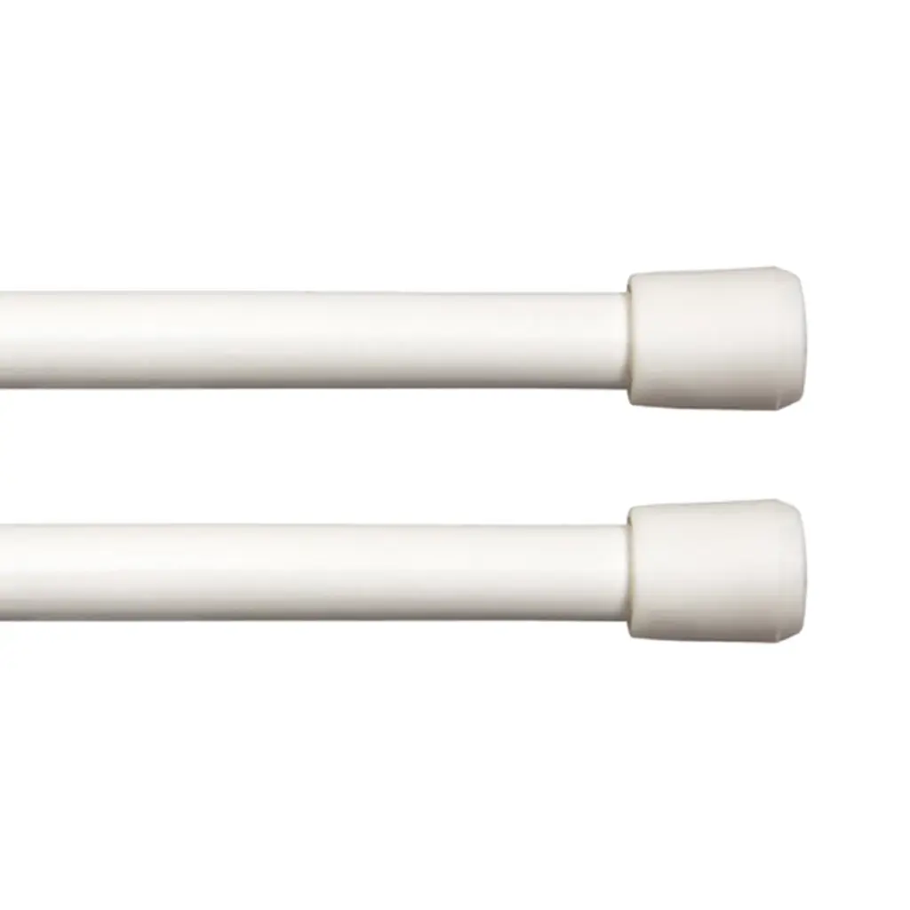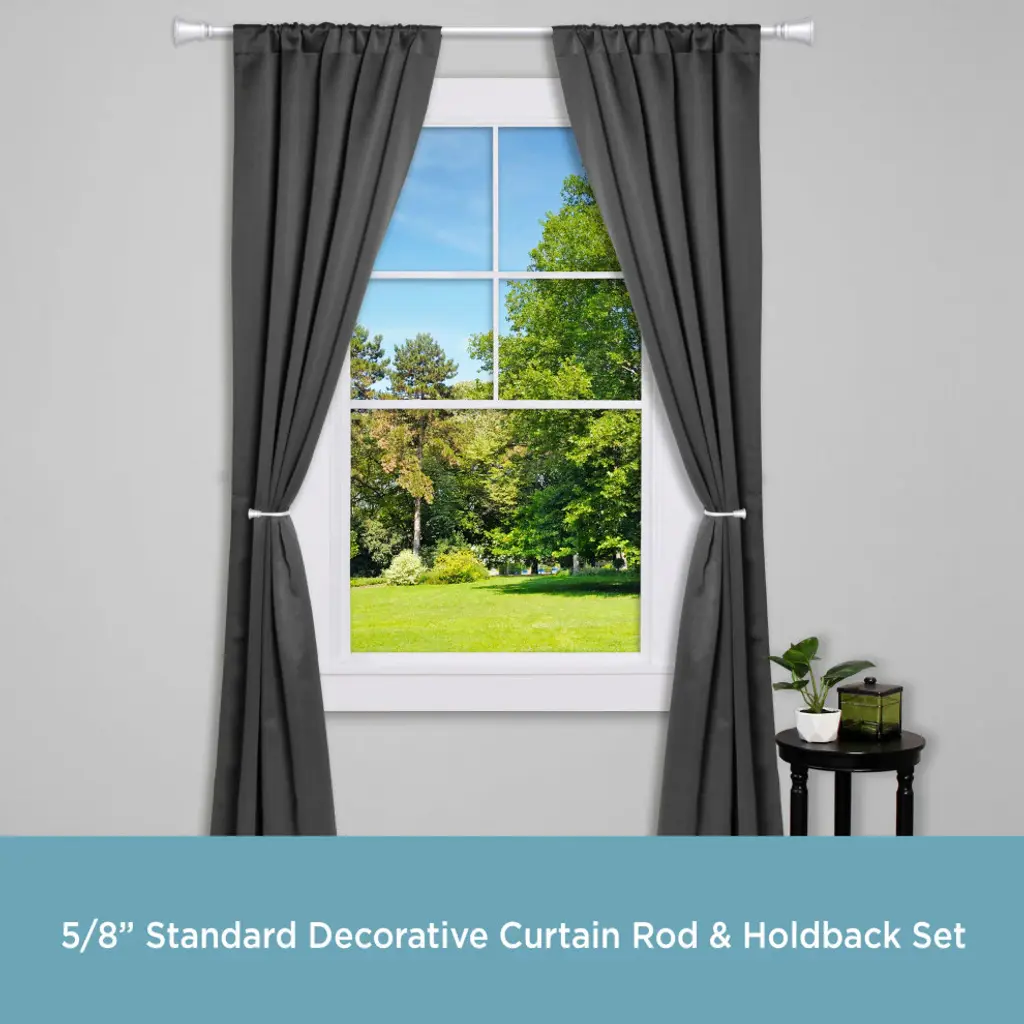 Add a touch of style to your home with the Trumpet Decorative Curtain Rod & Holdback Set by Kenney.The 5/8 inch diameter Trumpet curtain rod in satin nickel features matching decorative finial ends. Use in your bedroom or living room to hang light to medium-weight curtains. The telescoping rod adjusts from 84 inches to 120 inches to fit your window and projects 2.68 inches from the wall. It is ideal for hanging curtains with pockets, grommets, back tabs, and tab tops, but can also be used with clip rings. Pair with the included beautiful and functional holdbacks help to frame your window and let light in. Set Includes: one telescoping steel curtain rod with decorative finials (1.66" L x 1.42" W x 1.42" H), two decorative holdbacks (8" L x 6" W x 1.25" H), two mounting brackets, screws, one center support, drywall anchors, and installation instructions. • The Kenney® Trumpet 5/8" Standard Decorative Window Curtain Rod features decorative finials• For use with light to medium weight curtains in your bedroom or living room• Included holdbacks frame window to let light in• Each holdback measures 8" L x 6" W x 1.25" H• Steel rod and holdbacks with decorative finials and matching mounting hardware• Includes: one telescoping curtain rod with finials, two holdbacks, two brackets, screws, one center support, drywall anchors, and installation instructions• 5/8" diameter curtain rod adjusts from 84-120" to fit your window and projects 2.68"� from the wall"