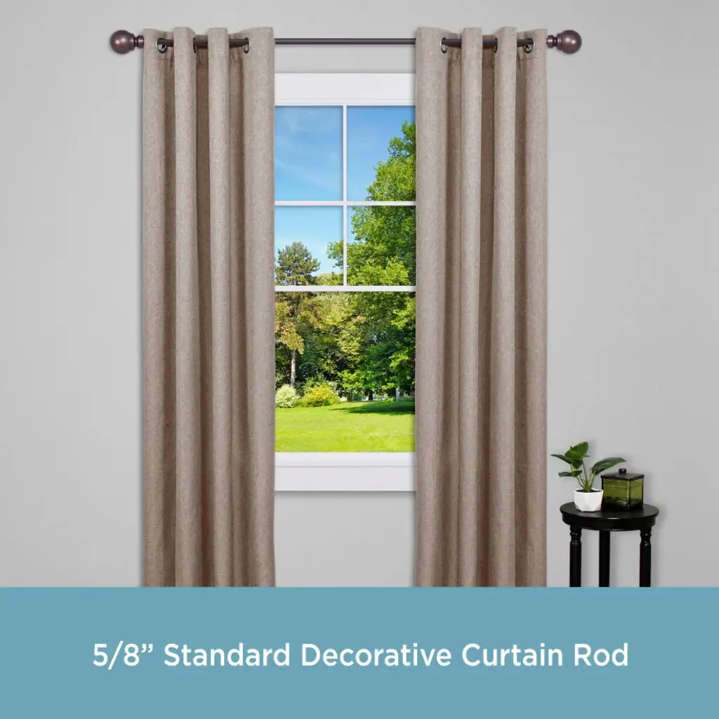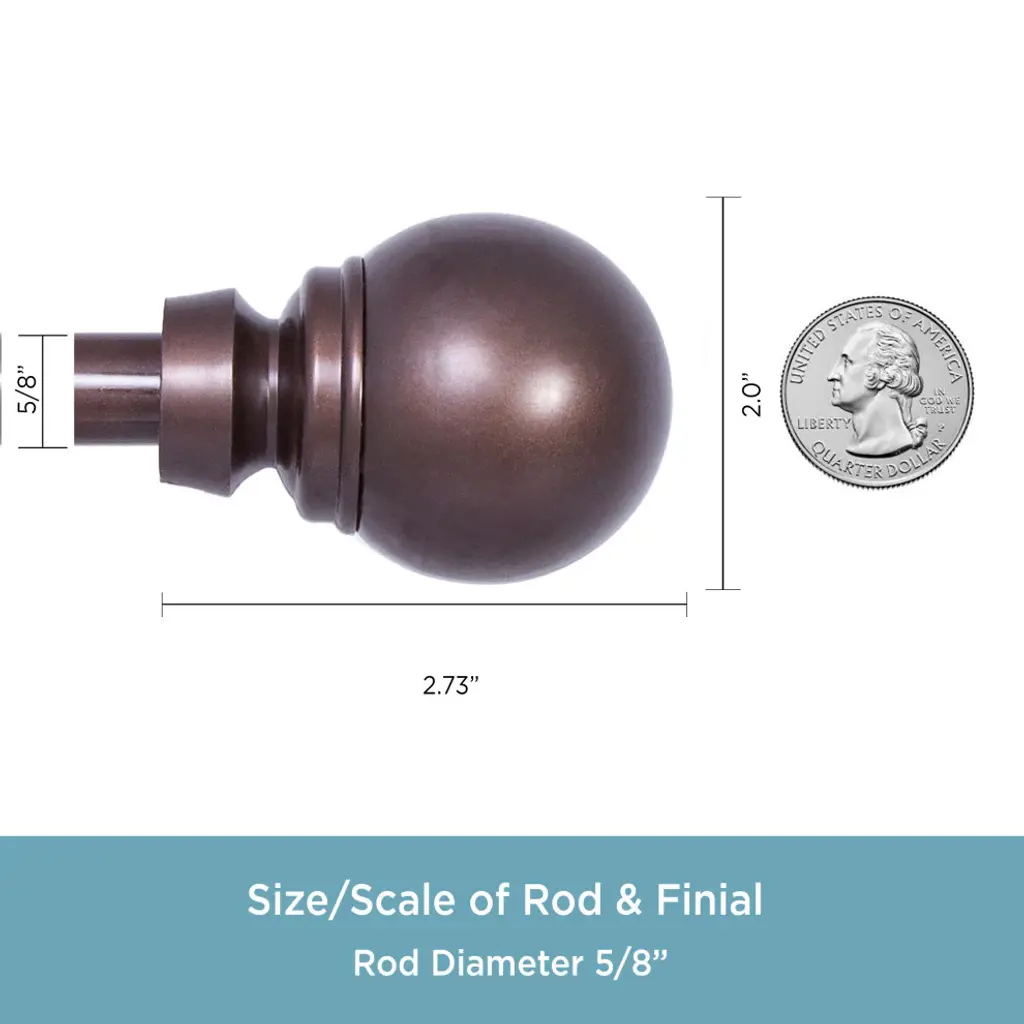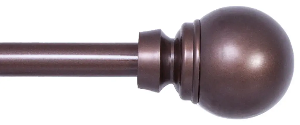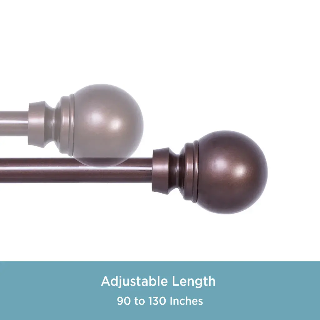 "Add a touch of style to your home with the Mae 5/8" Standard Decorative Window Curtain Rod by Kenney®.The 5/8 inch diameter decorative curtain rod in chocolate features matching decorative ball finial ends. Use in your bedroom or living room to hang light to medium-weight curtains. The telescoping rod adjusts from 90 inches to 130 inches to fit your window and projects 2.97 inches from the wall. It is ideal for hanging curtains with pockets, grommets, back tabs, and tab tops, but can also be used with clip rings. Drapery Hardware Set Includes: one telescoping steel curtain rod with decorative finials (2.73" L x 2.0" W x 2.0" H), two mounting brackets, screws, drywall anchors, and installation instructions. • The Kenney® Mae 5/8" Standard Decorative Window Curtain Rod features decorative ball finials• 5/8" diameter curtain rod adjusts from 48-86" to fit your window and projects 2.97"� from the wall• For use with light to medium weight curtains in your bedroom or living room• Steel rod with decorative finials and matching mounting hardware• Includes: one telescoping curtain rod with finials, two brackets, one center support, screws, drywall anchors, and installation instructions"