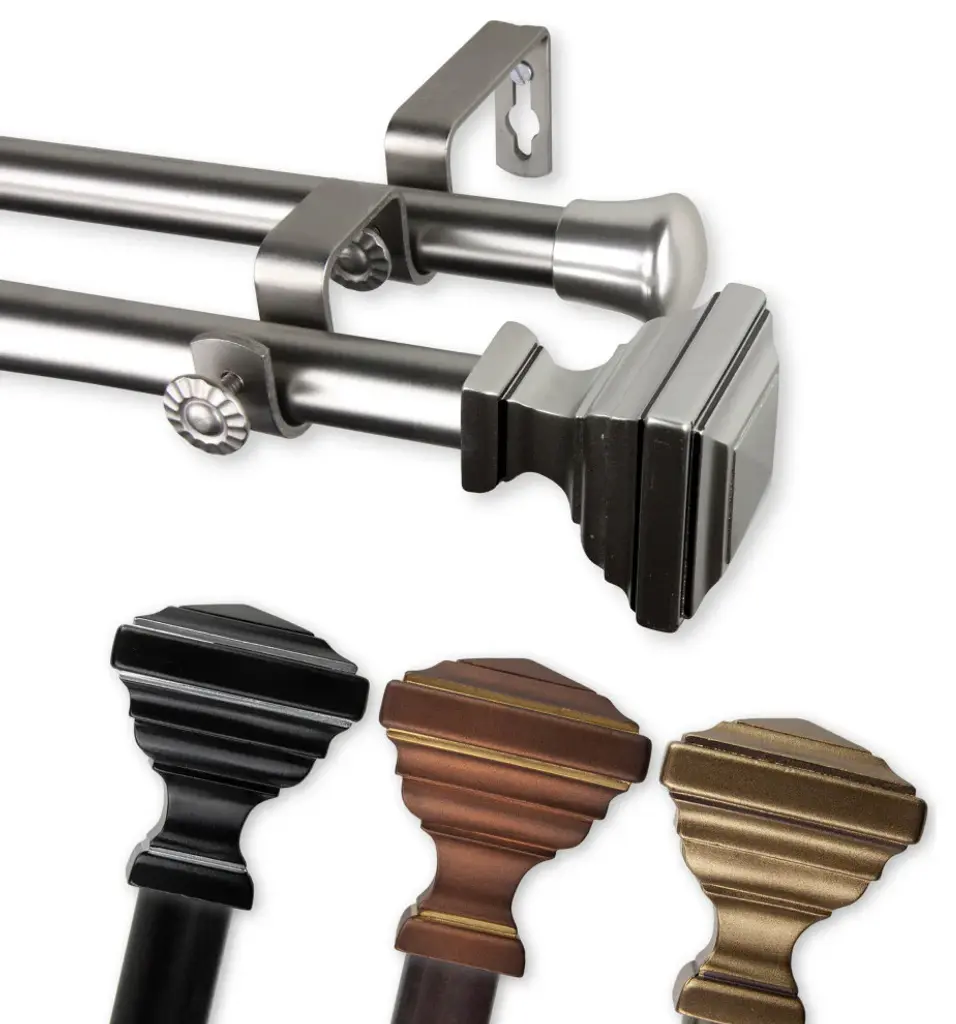 Central Design Products presents the perfect enhancement to your window treatment with high-end quality Double Curtain Rods. Designed to add a modern touch to any window. Includes 2 curtain rods of 13/16" diameter, 4 brackets, and mounting hardware. Projection: 6.375" Front rod to wall, 3.75" Back rod to wall Rod Diameter: 13/16" Material: Steel Color: Cocoa