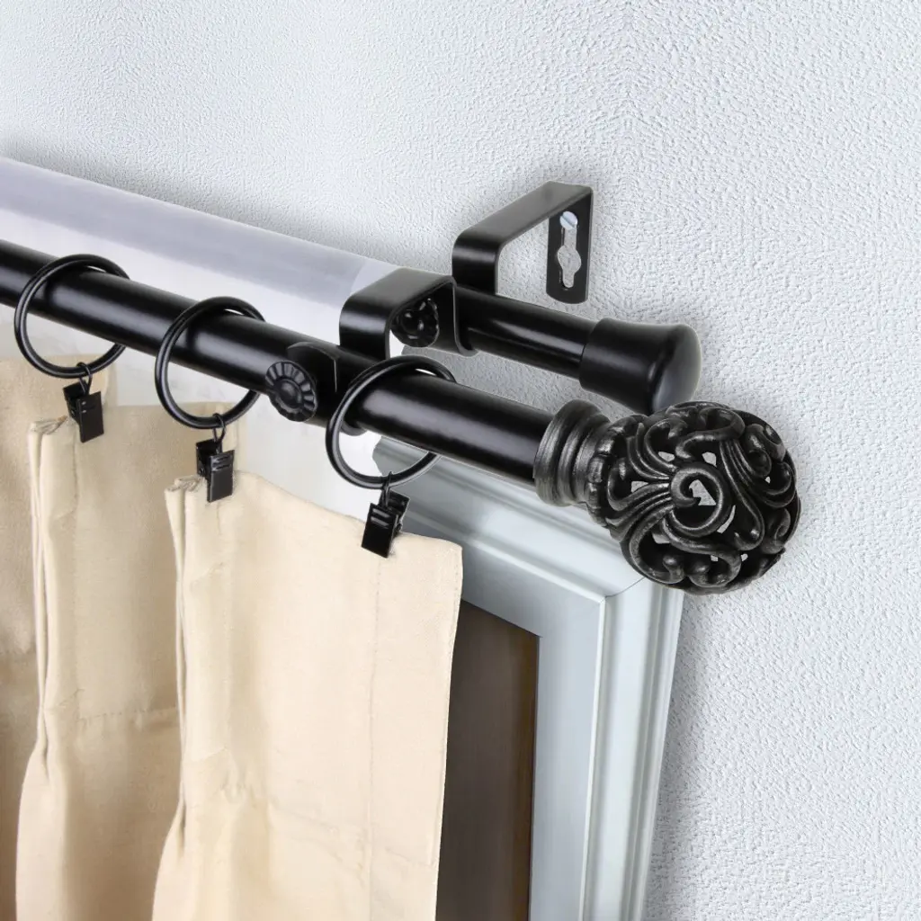 Introduce an elegant touch to your window treatment with this beautiful 13/16" diameter double curtain rod set, made of high quality steel rods. Includes 2 telescoping steel pole, mounting hardware, brackets, and 2 finials Projection: 2.875" Finial measurement: 2.5" W x 1.75" H x 1.75" D