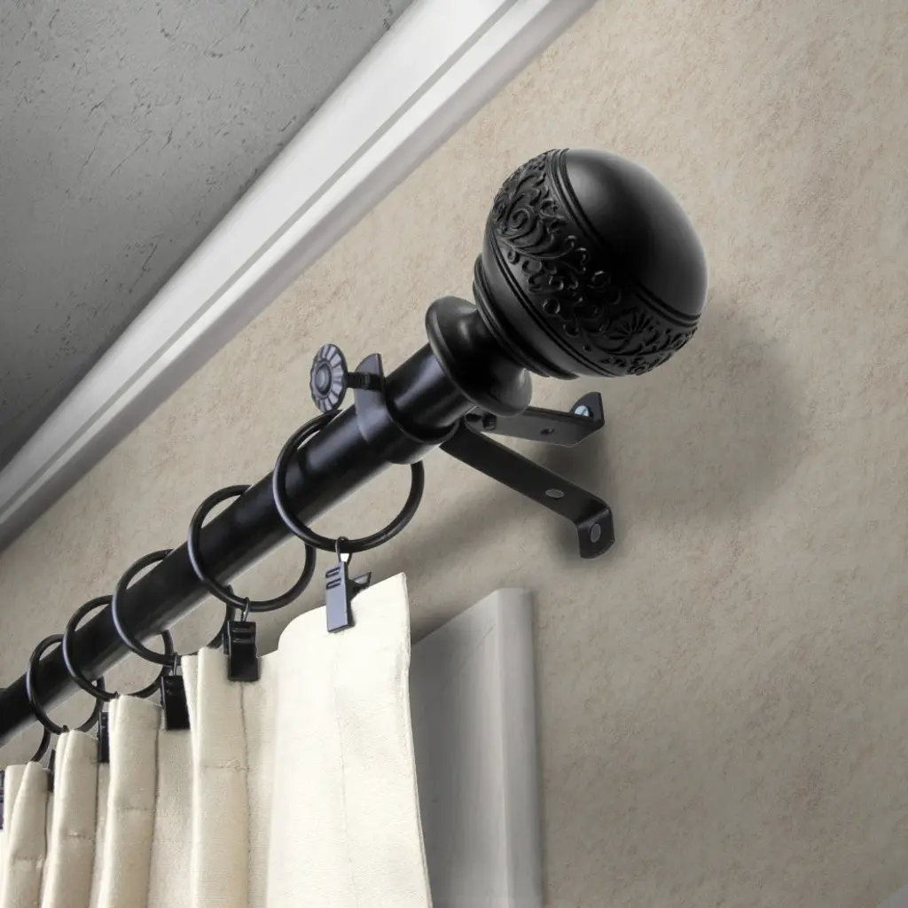 Introduce an elegant touch to your window treatment with this beautiful 13/16" diameter curtain rod set, made of high quality steel rods. Includes telescoping steel pole, mounting hardware, brackets, and 2 finials Projection: 2.875" Finial measurement: 2.75" W x 2.5" H x 2.5" D