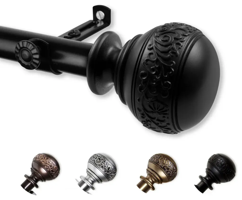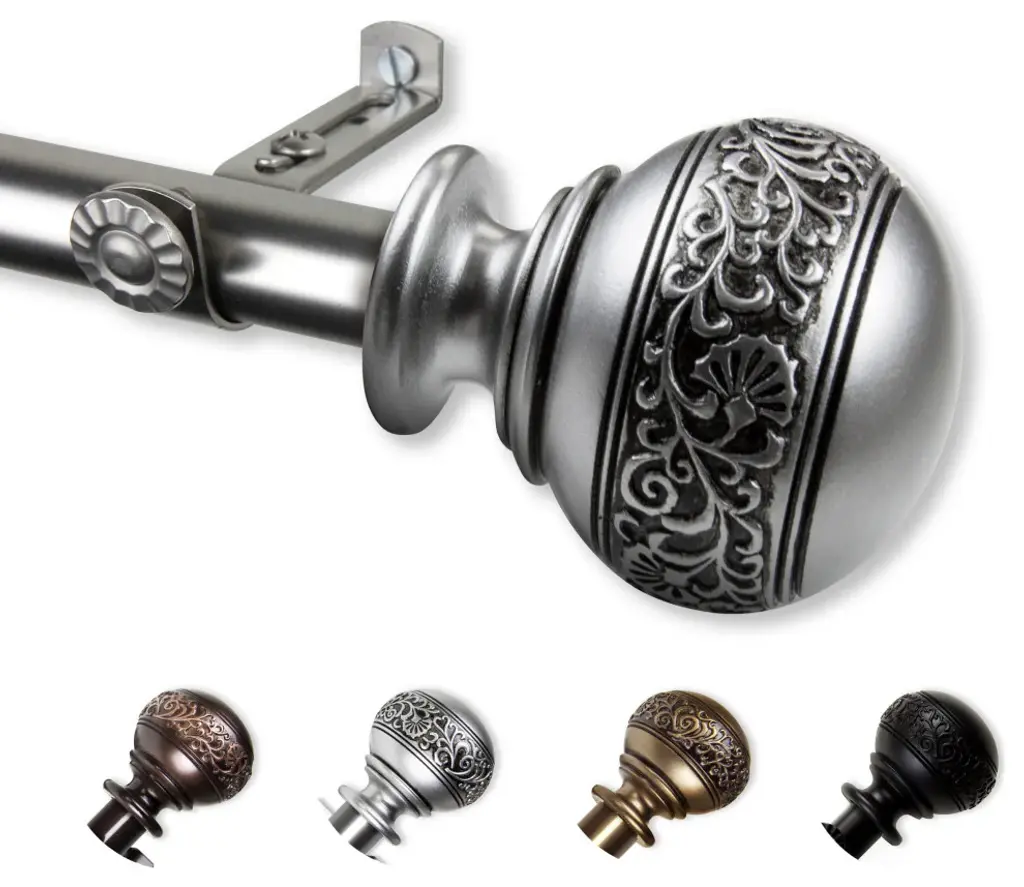 Introduce an elegant touch to your window treatment with this beautiful 13/16" diameter curtain rod set, made of high quality steel rods. Includes telescoping steel pole, mounting hardware, brackets, and 2 finials Projection: 2.875" Finial measurement: 2.75" W x 2.5" H x 2.5" D