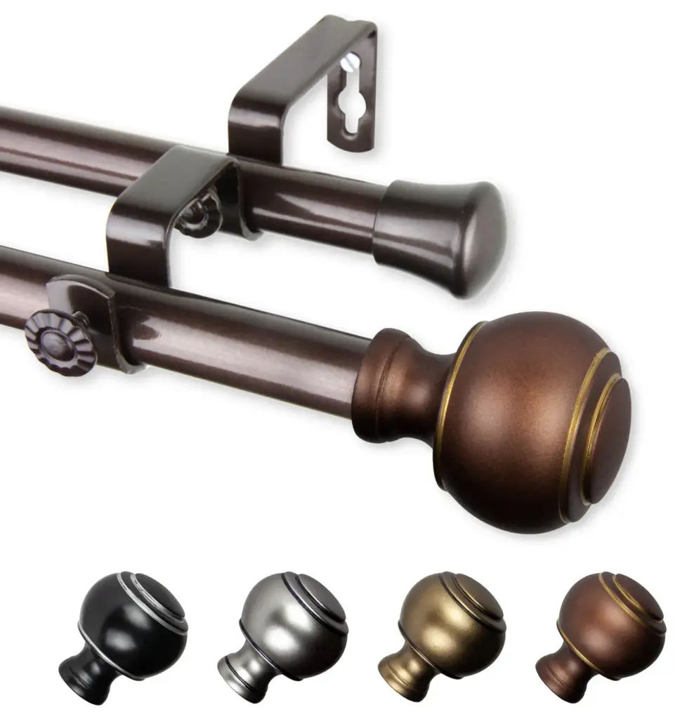 Update your home decor with Rod Desyne Drapery Hardware. This classic double curtain rod adds a refined touch and elegant charm to your living area. Complete your home d?cor with matching single rods, holdbacks, and curtain rings.Features:Includes two 5/8 inch diameter high quality steel telescoping poles, extends 48-84 inch, 3 brackets and 2 finialsEach Luna finial measures W 2" x H 1-1/2" x D 1-1/2"Projection: wall to back rod: 3.75", wall to front rod: 6.25"