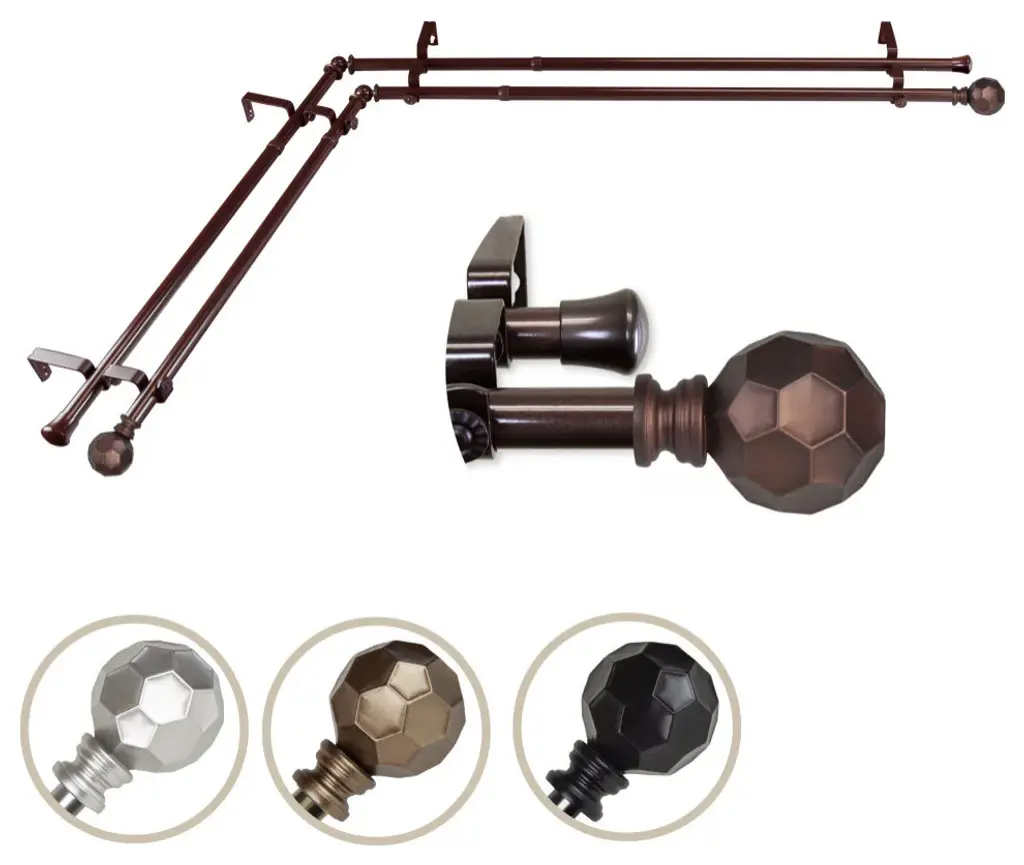Easily and effortlessly decorate your corner windows with curtains and sheers/valences. 2 sets of two 13/16 in. curtain rods attach via corner ball connector that allows for nearly 360 of rotation. These high quality steel rods are accented with decorative finial end pieces.Includes: four 13/16" in diameter rods, finials, corner connectors, and mounting hardware.Front rod projection: 6.375 in. back rod projection: 3.75 in.Finial Measurement: 3-1/8" W X 2-1/2" H x 2-1/2" DSteel Rod and Resin FinialInstallation instructions included