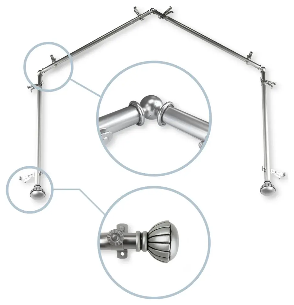 Our Multi Sided Bay Window Rod are the perfect way to decorate a multi-sided bay window with a stylist touch not often found. Offered in 3 different variations, 4, 5 and 6-sided rods can be used for multi window and bay windows. Rods connect using our corner connector which allows for a nearly 360 rotation.Includes four 13/16" diameter rods, 2 finials, 3 corner connectors, and mounting hardware. Rod Projection: 2.875"Finial Measurement : 2-1/2" W x 2-1/8" H x 2-1/8" DEach rod extends from 28-48"Steel Rod and Resin Finial Instruction Included