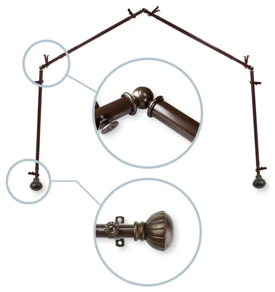 Our Multi Sided Bay Window Rod are the perfect way to decorate a multi-sided bay window with a stylist touch not often found. Offered in 3 different variations, 4, 5 and 6-sided rods can be used for multi window and bay windows. Rods connect using our corner connector which allows for a nearly 360 rotation.Includes four 13/16" diameter rods, 2 finials, 3 corner connectors, and mounting hardware. Rod Projection: 2.875"Finial Measurement : 2-1/2" W x 2-1/8" H x 2-1/8" DEach rod extends from 28-48"Steel Rod and Resin Finial Instruction Included